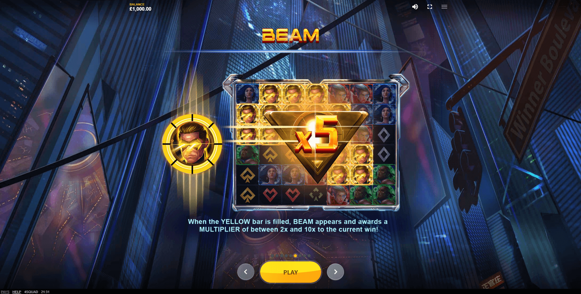 Beam. The golden superhero doesn’t alter the reels directly but awards a Multiplier to all wins from the current spin. The value of the Multiplier is chosen at random and can range from x2 to x10. If the Beam meter fills up again during the same spin, the Multiplier increases by an additional random value — a big advantage for the player.