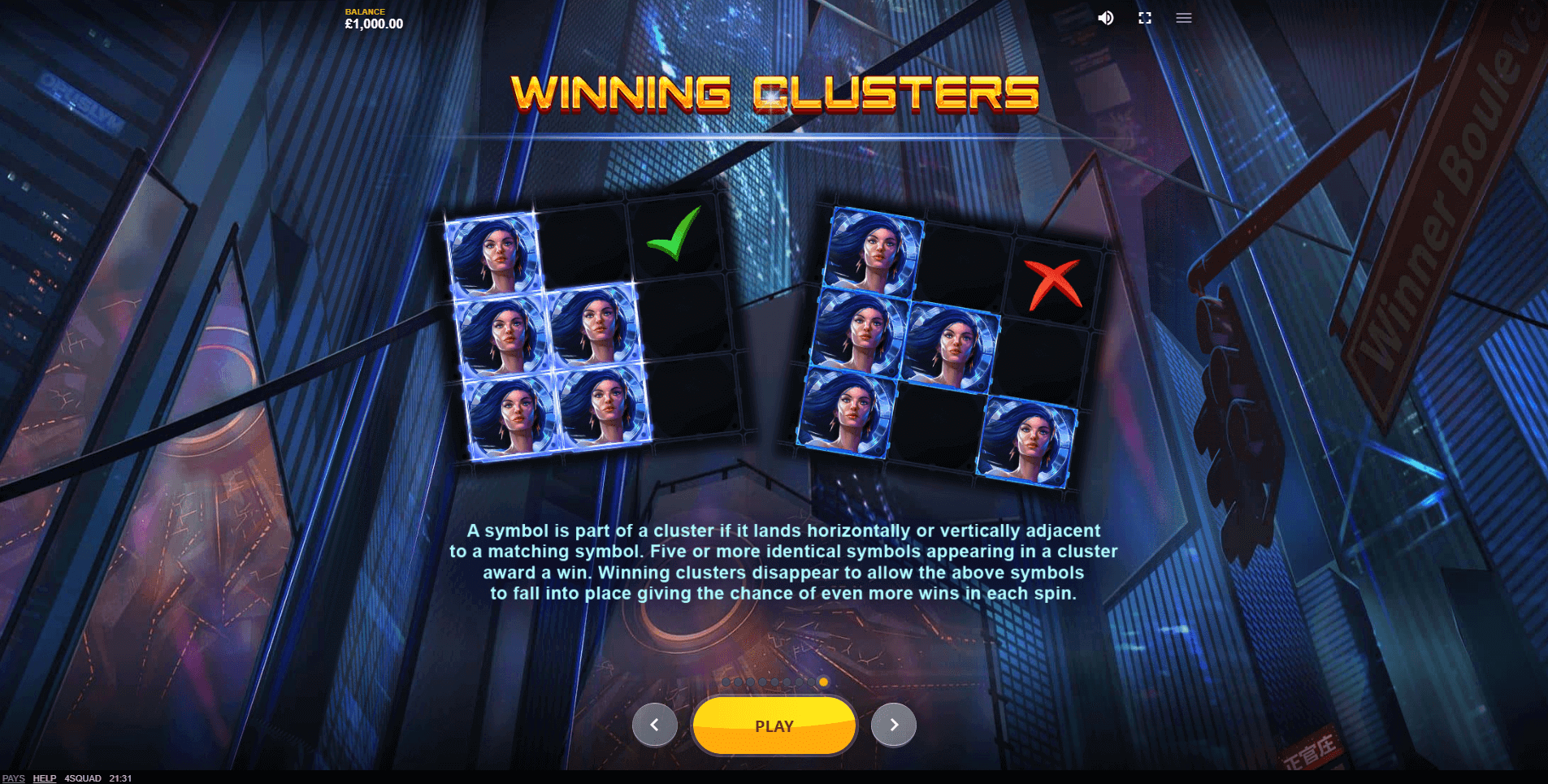 Strike. The blue superheroine in 4Squad unleashes her power by adding Wild symbols to the reels. What makes this feature unique is that it’s the only way to get substitute symbols — they don’t drop on the reels in the regular way. Wilds can complete any cluster, even if it starts with just a single symbol, but they cannot create a cluster on their own.