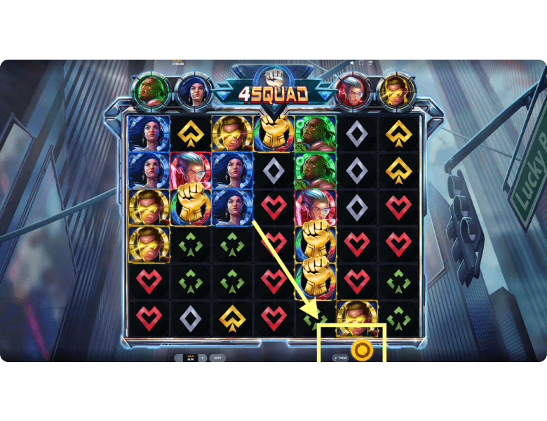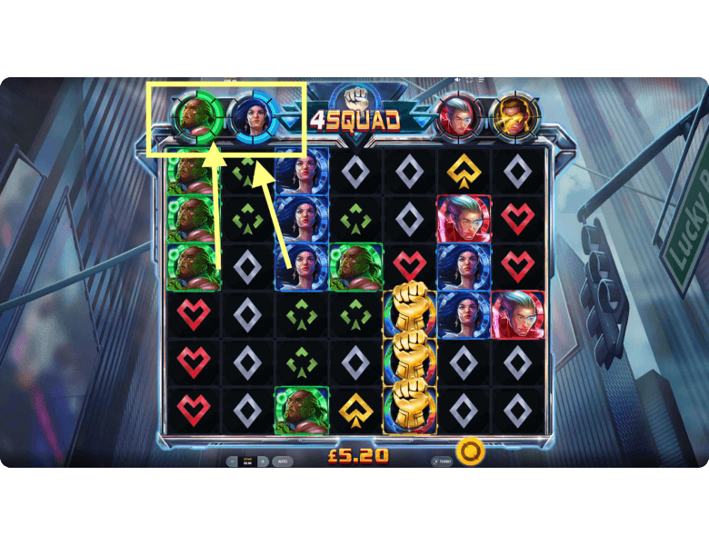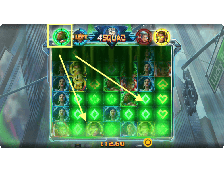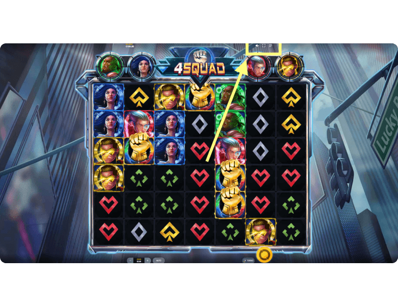 Bonuses and Features of 4Squad. This slot machine gives players the chance to score impressive payouts through 4 unique features. Each one is triggered when the meter of a superhero is fully charged by winning clusters of the matching color. And if you manage to charge all 4 heroes at once, 4Squad unleashes its main bonus round with the highest chances of landing a big win.