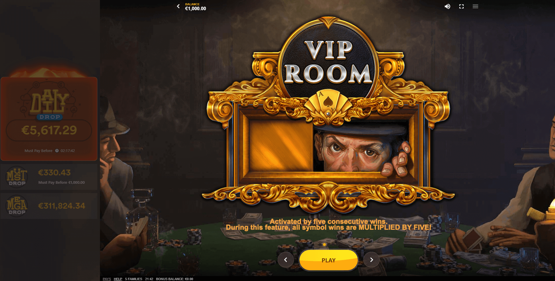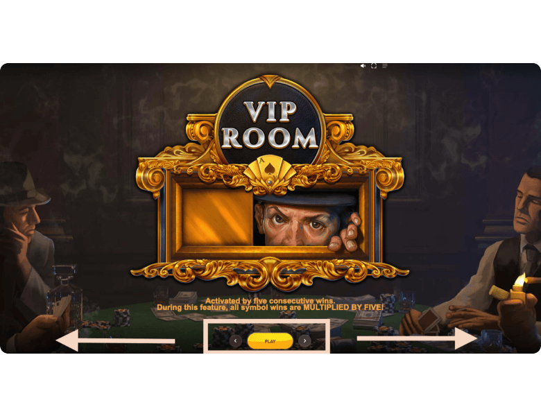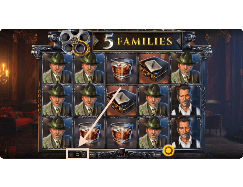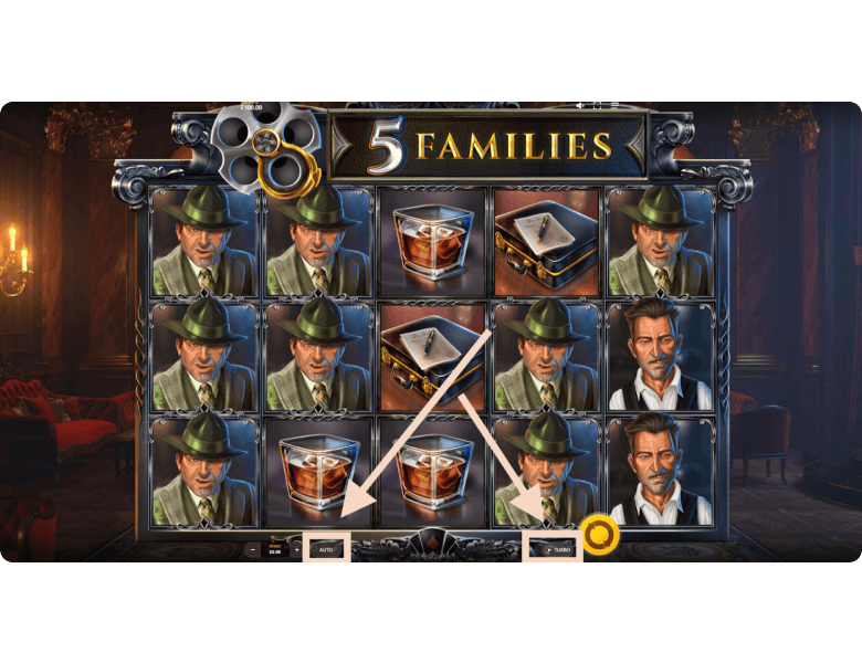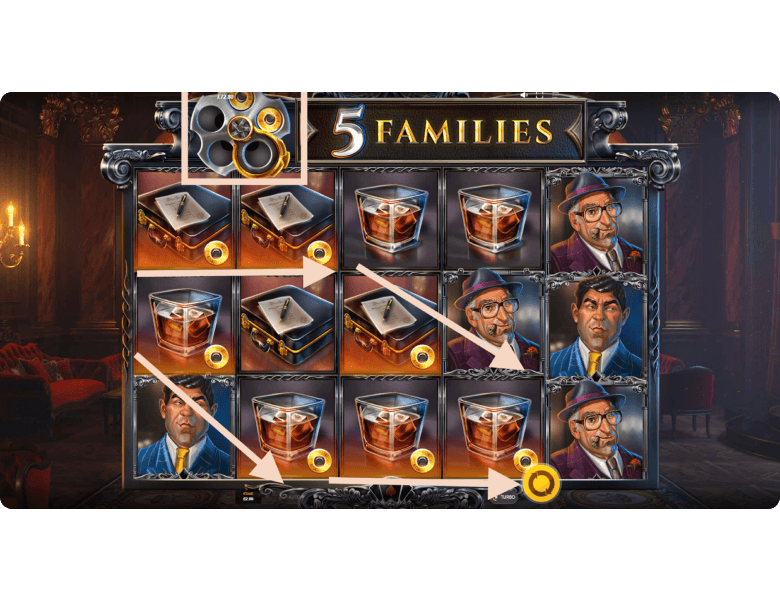 VIP Room Symbol Wins. Each winning spin loads the revolver, located at the top of the screen, with one bullet. Once the player lands five consecutive winning spins, the revolver’s chamber becomes fully loaded, and 5 Families switches into the VIP Room mode for playing with the best prizes. This is the second game mode, where the symbols not only look richer — they actually pay more. The same newspaper, now shown with a pistol, awards x1 instead of x0.2 for the minimum combination. The mafia boss in a white suit, now holding an expensive cigar, pays x10 instead of x2 for three symbols on a line. The player continues receiving payouts in this mode until five consecutive losing spins occur. When that happens, the game returns to the Regular Symbol Wins mode until the next series of five wins.