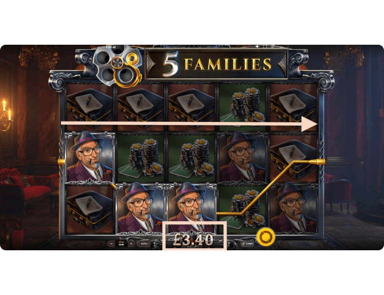 Regular Symbol Wins. When launching 5 Families, players can review the payout table to see how much each payline awards. For example, the cheapest symbol — the newspaper — multiplies the bet by x0.2 for the minimum combination, while the most valuable symbol — the gangster in a white suit — pays x2 for three matching symbols. Only the highest combination on each line is paid, counted from left to right, and payouts from multiple lines are summed up.
