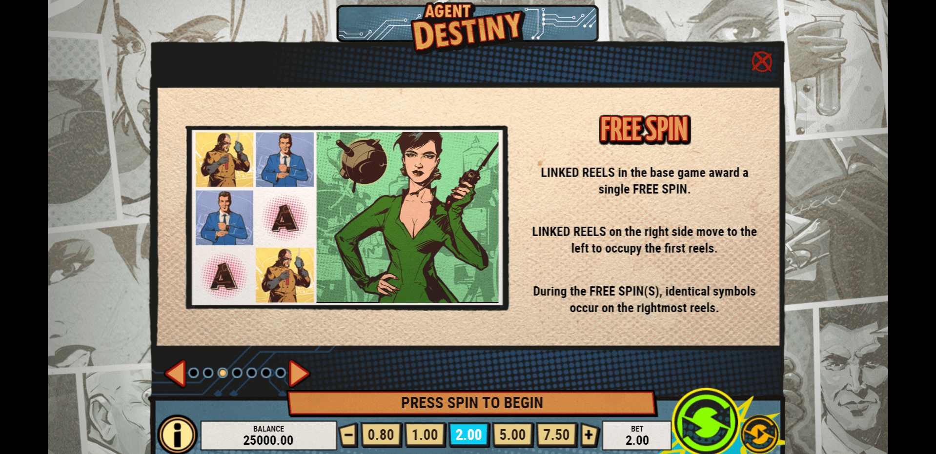 Agent Destiny also includes a full-on Free Spins round. Landing 3 Scatter symbols anywhere on the reels awards 9 Free Spins. During this bonus, identical symbols tend to appear further to the right, gradually moving left with every spin. This shifting mechanic keeps the action dynamic and adds more excitement to the gameplay.
