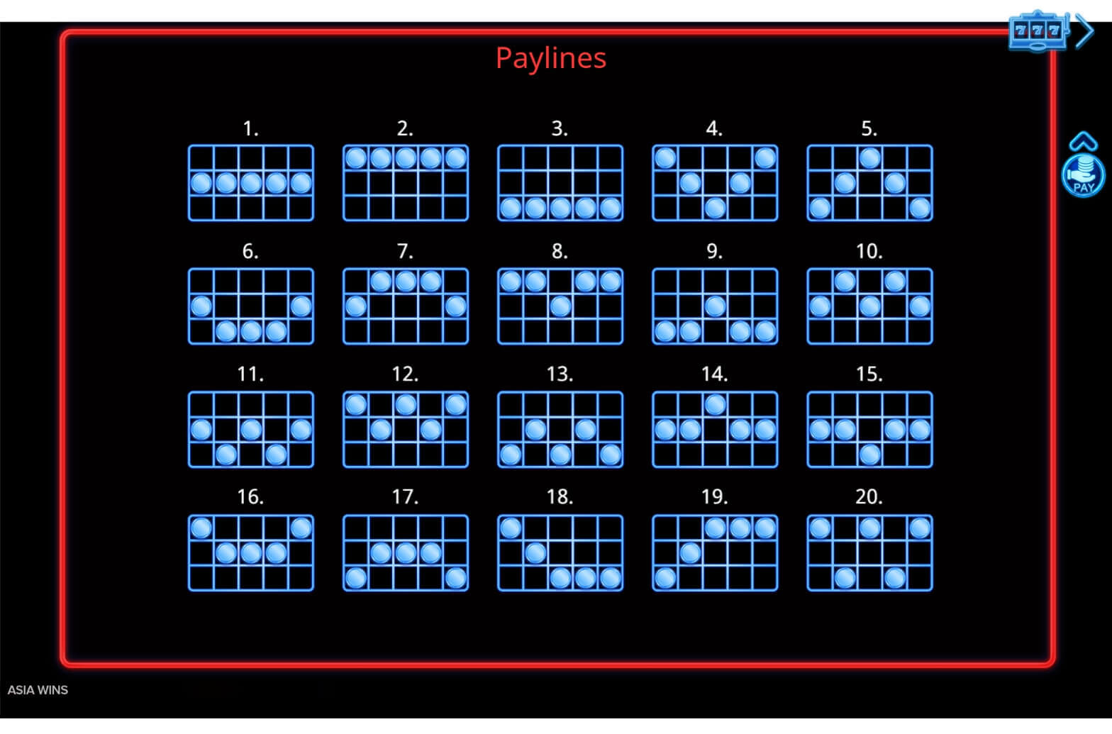 This is a video slot game with five reels and three rows in height. In total, they form x15 grid in the game with 20 available paylines. The amount of winning combinations in the game is not fixed and the player can manually choose more or fewer lines. To change the amount of lines, simply press the “plus” and “minus” buttons on the bottom of the interface and gamble with that amount of winning combinations that you like!