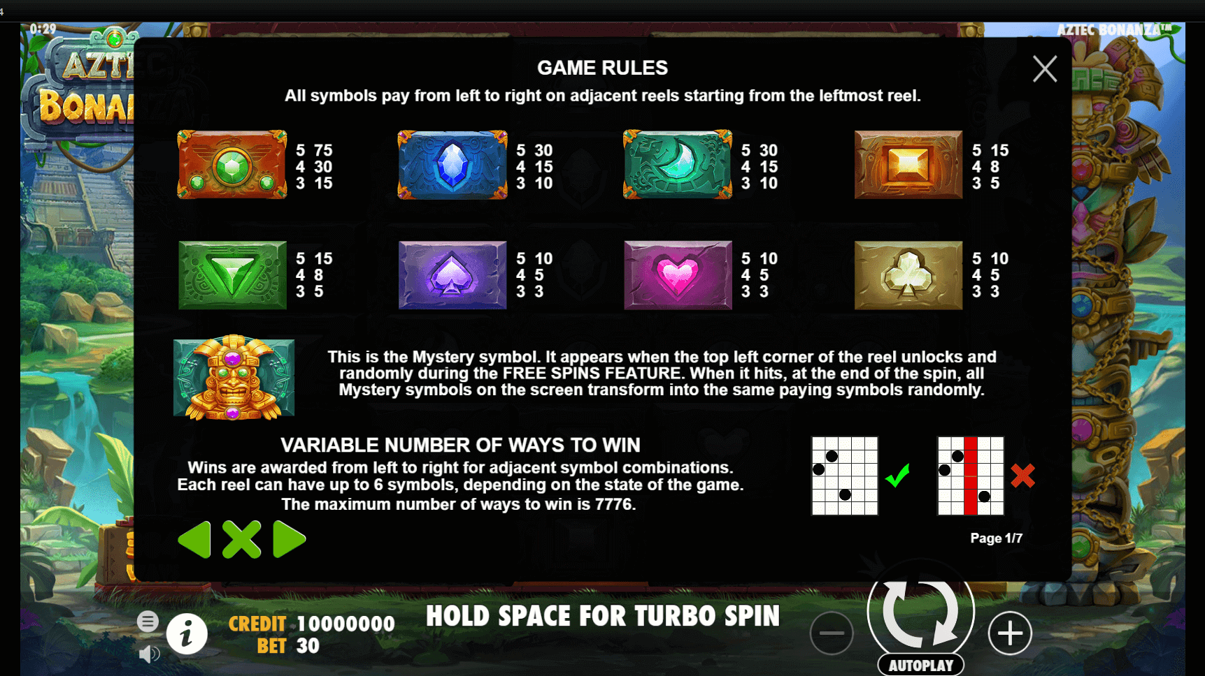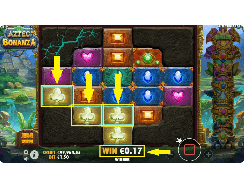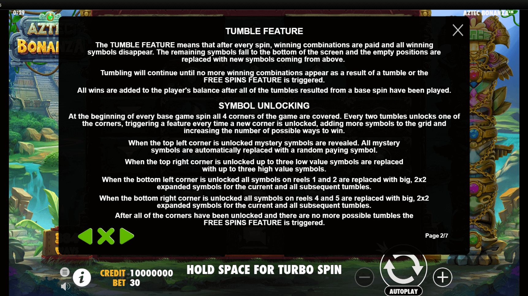 Aztec Bonanza is built on the Tumble mechanic, where winning symbols disappear, and new ones fall into their place. With every second tumble, the closed corners of the grid open up. This gradually expands the field and increases the number of ways to win - from the initial 384 to the maximum 7,776.