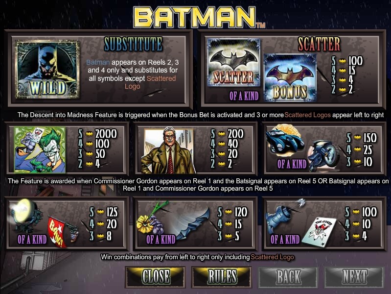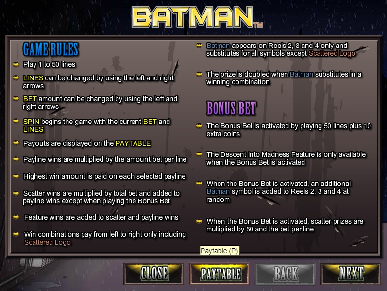 The management of the “Batman” game machine is easy, more like a modern computer game. The Lines and Bet buttons set the paylines and bet accordingly. The SPIN button starts scrolling. You can also turn Auto-backs on the bottom left of the screen and even set the number of automatic scrolls.
