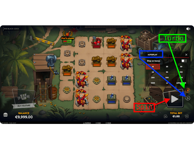 Big play button on the right fires a single spin. Tap it again mid-spin to skip the animation, or toggle Turbo mode above it so every spin resolves faster by default. For hands-off sessions, Autoplay lets you set a spin count with loss and win stop limits. Handy when you’re grinding base game waiting for a trigger.