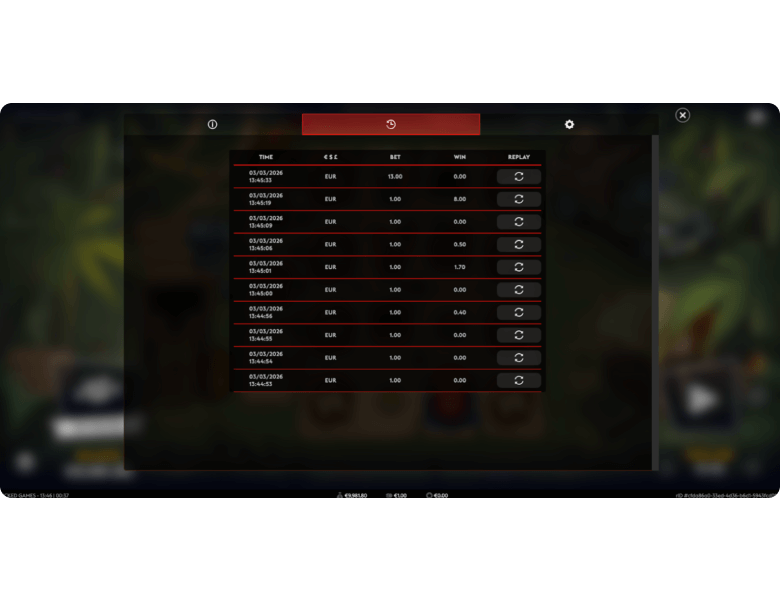 Tap the History icon to pull up your previous rounds. Each entry shows the date, currency, bet size, and win amount. There’s a replay button on every round, too. You can rewatch the full spin in the game client, which is clutch for figuring out how the big hit actually came together.