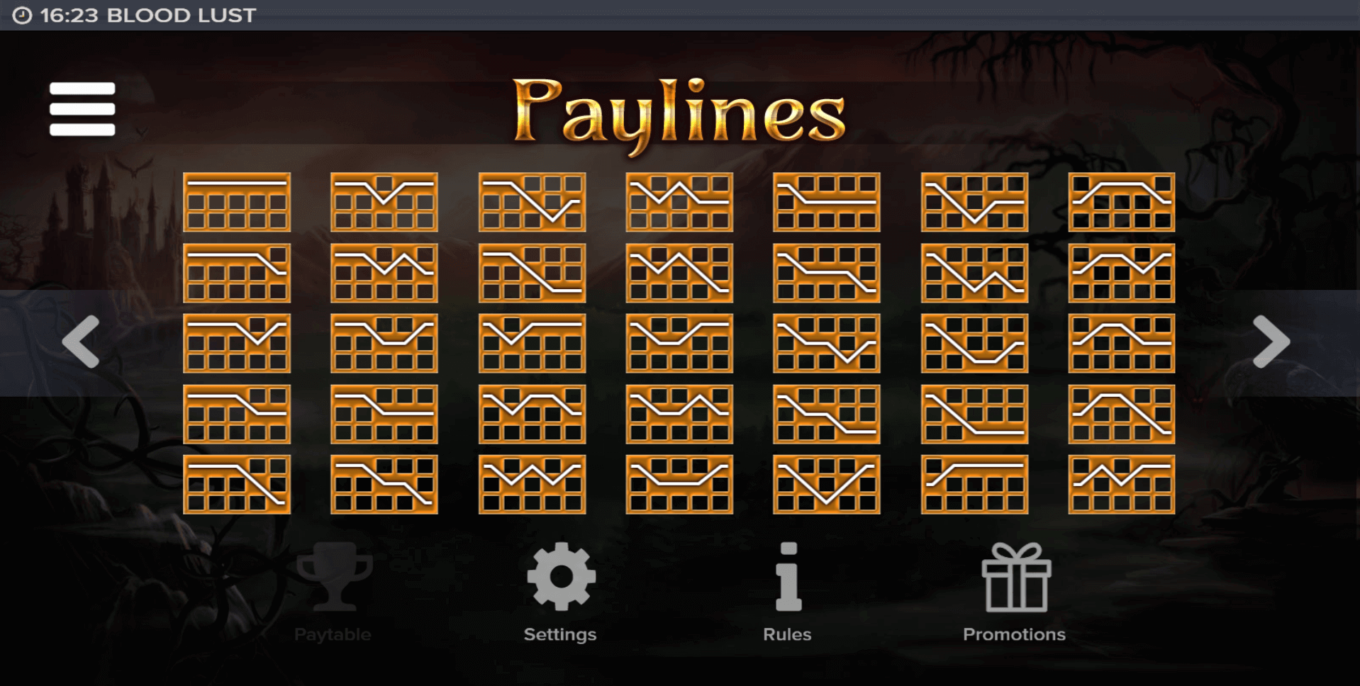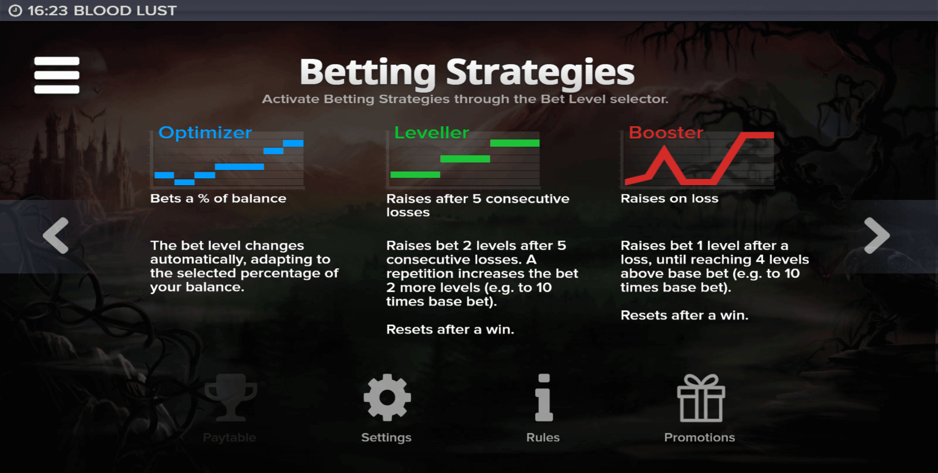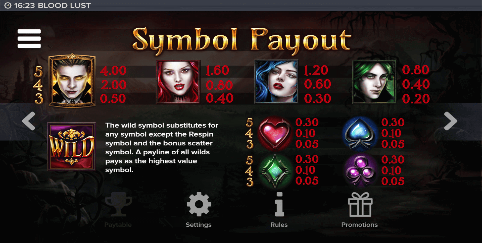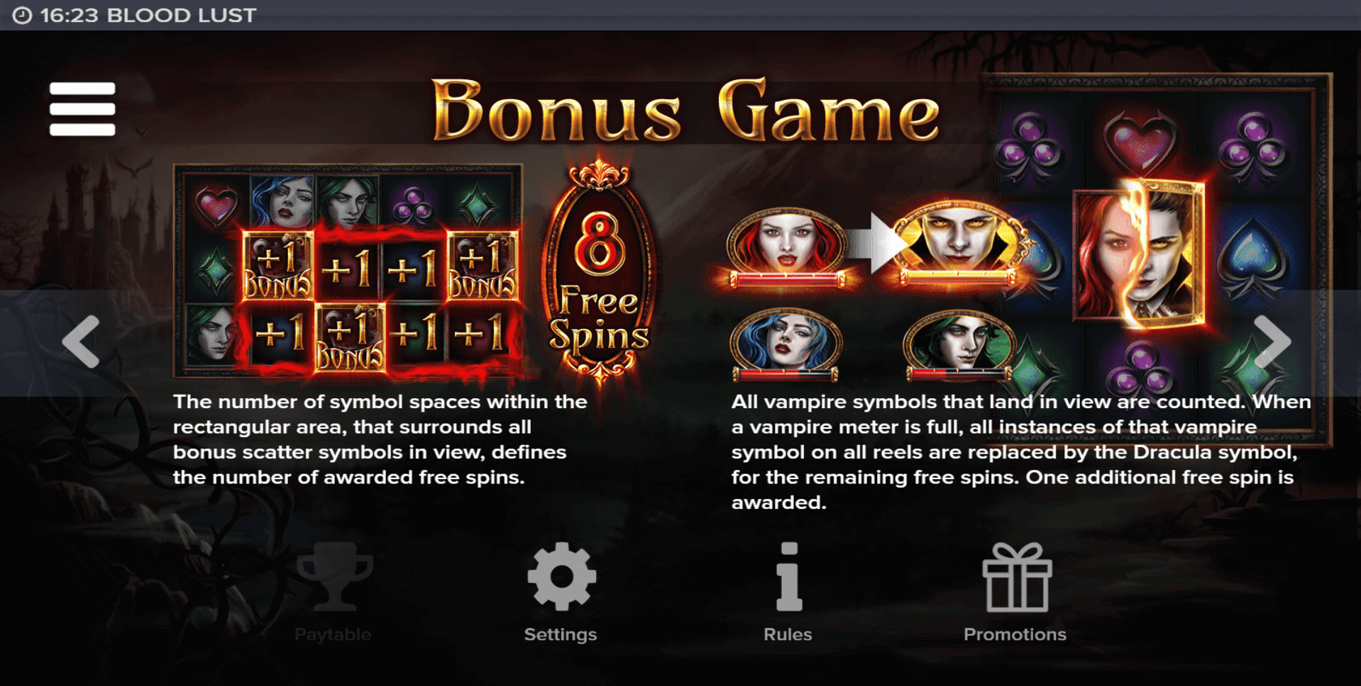 Bonus Game. Another bonus symbol in Blood Lust is the vial of blood. Three such symbols trigger a free spins round, with the number of spins determined randomly — from 3 to 15. During the round, all vampire symbols fill special meters, charging the mystical creatures with power. Once one of them is fully charged, all of its corresponding symbols on the reels transform into Dracula — the highest-paying icon. The more Draculas appear, the higher the winning potential for the remaining spins. And to give the player more chances to enjoy this feature, each filled meter awards one additional spin.