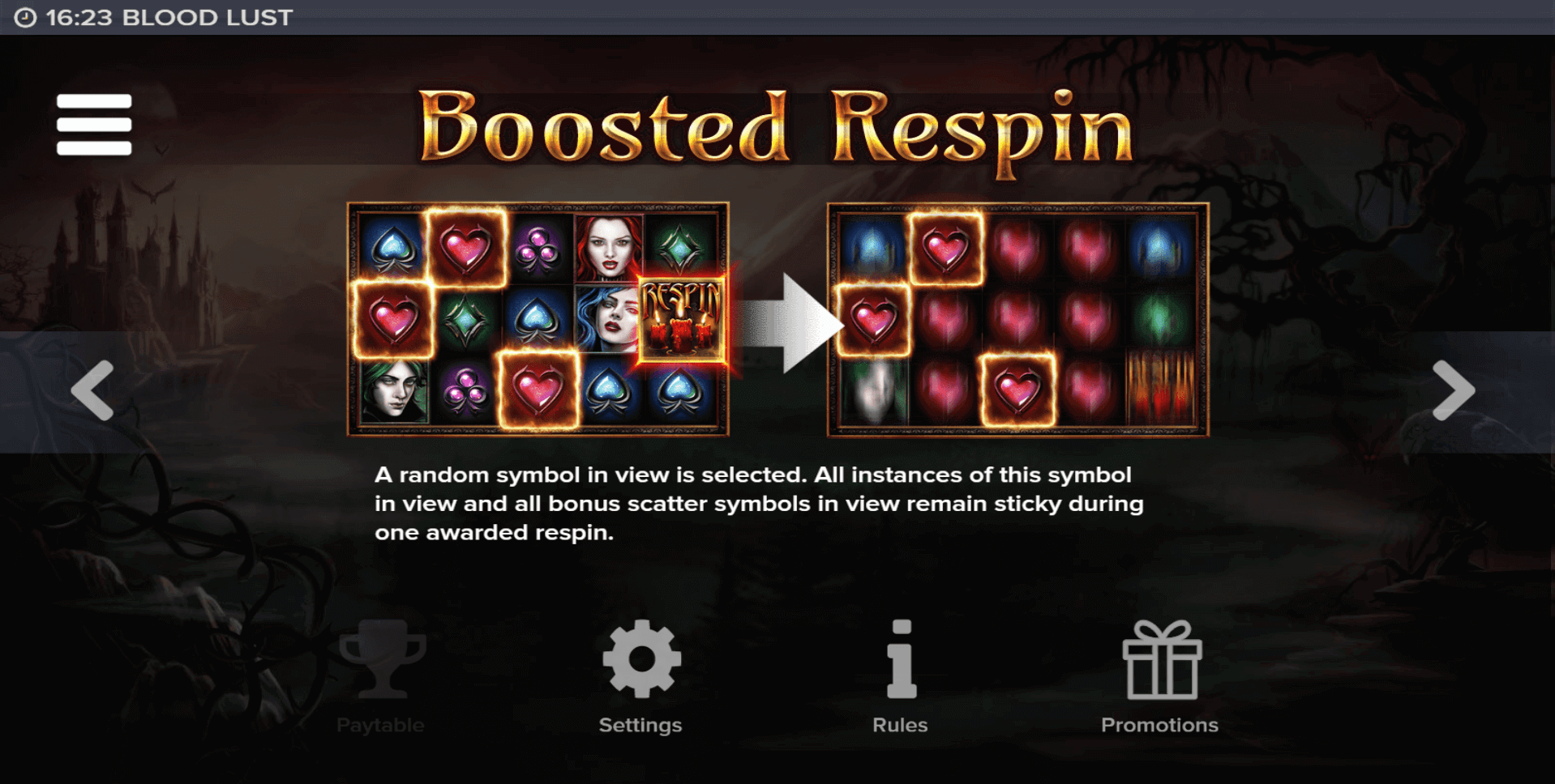 Respin Symbol. In Blood Lust, there is a symbol that can trigger a respin for a better win. It is depicted as candles and appears only on the fifth reel. As soon as the player catches it, several identical symbols are fixed on the screen, and the game activates a respin. If the player is lucky, this spin may add a few more identical symbols to the marked ones, improving the prize combination for the best winnings.