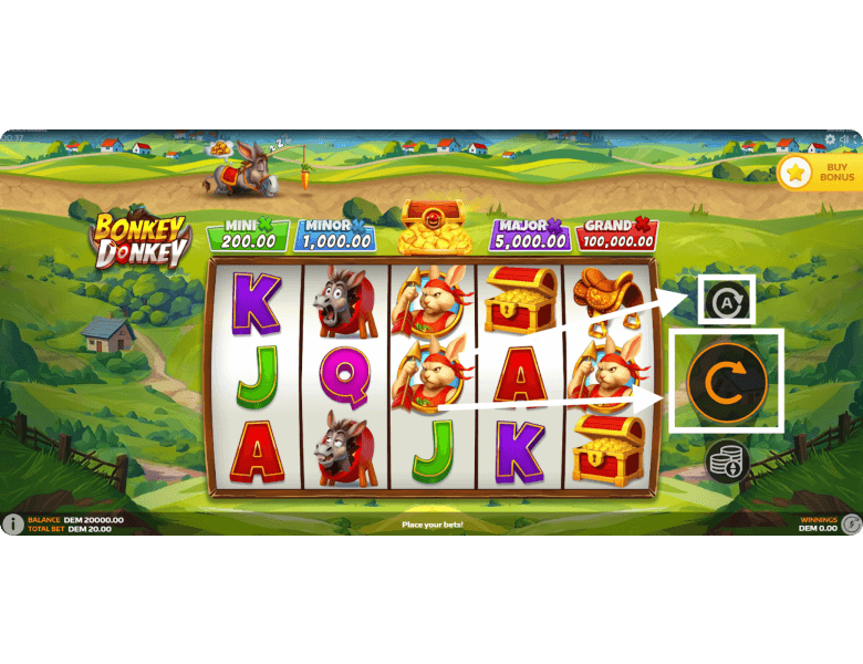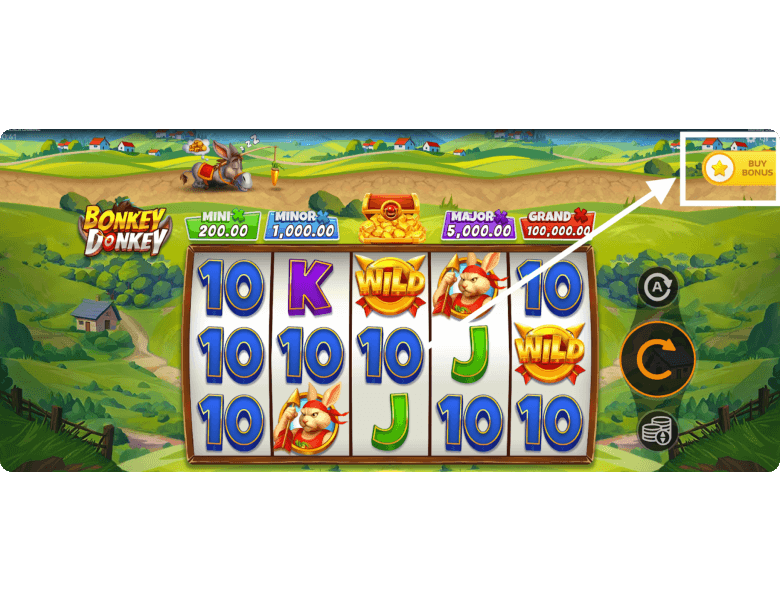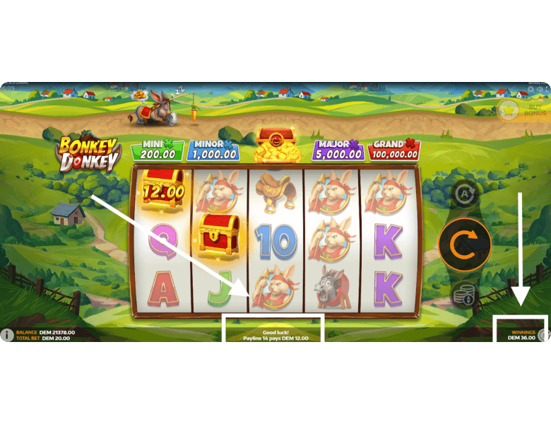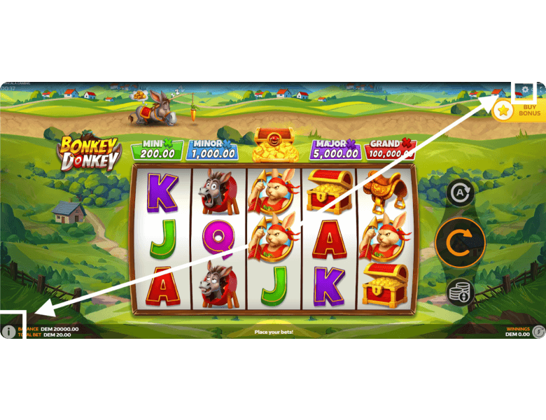 Jackpots. Bonkey Donkey features 4 fixed jackpots. The Mini pays x10 your bet, the Minor x50, the Major x250, and the Grand x5,000. The higher your wager, the larger each prize becomes. Jackpots can only be won one way — by collecting special symbols during the bonus round to move the donkey further along the path.