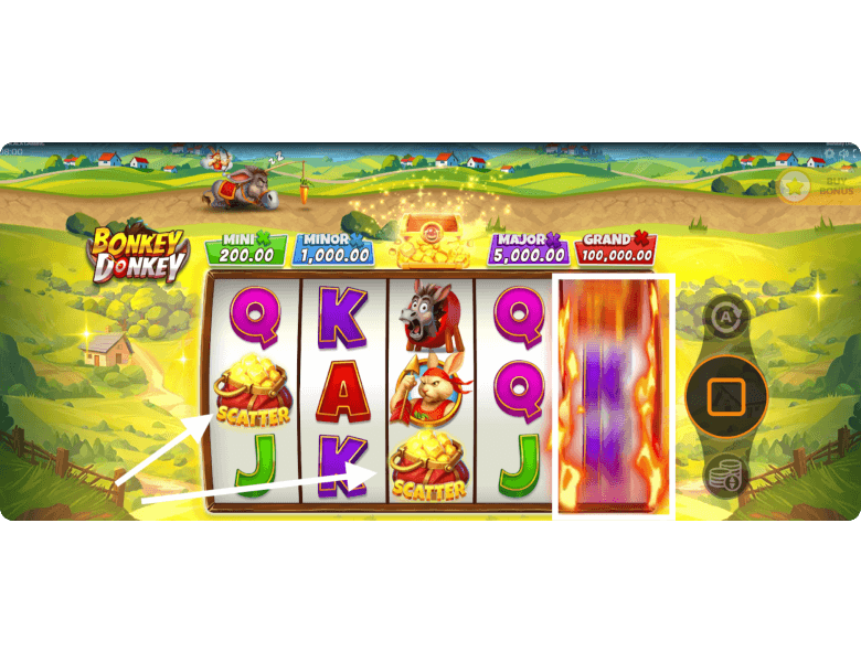 Scatter Symbol. In Bonkey Donkey, the bag of gold nuggets serves as the Scatter symbol. It appears on reels 1, 3, and 5, and is counted not by its position on paylines but simply by how many land on the reels. Hitting 3 Scatters triggers the super game with free spins — and a chance to win one or even several jackpots.