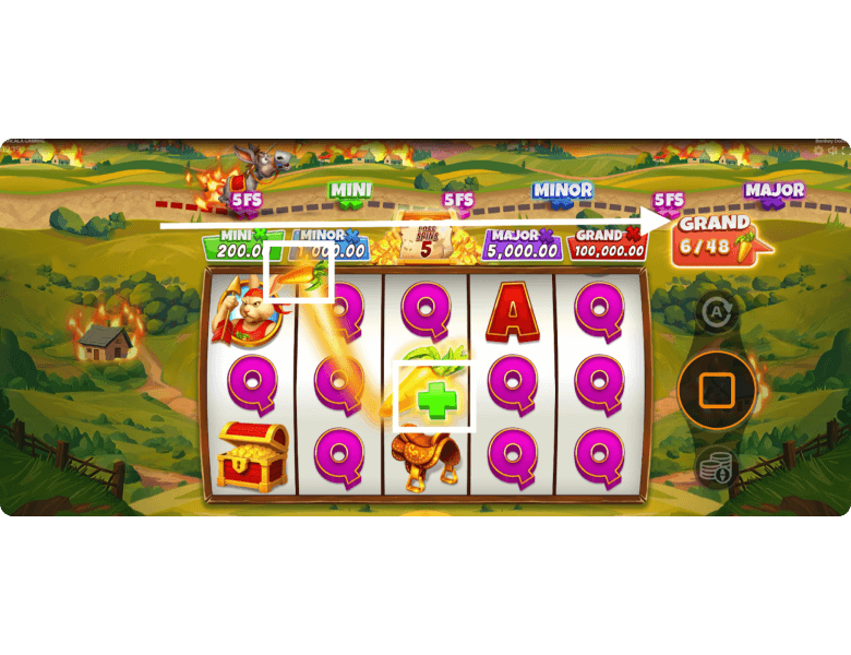 Special Symbol and Progress Bar. During the free spins bonus round in Bonkey Donkey, the donkey wakes up above the reels. Whenever a carrot (the special symbol) lands, the character moves forward. Collecting 6 carrots awards 5 extra spins, while another 6 carrots unlock the Mini Jackpot. To have the donkey complete the entire path and reach the Grand Jackpot, players need to collect 48 carrots during the bonus game.