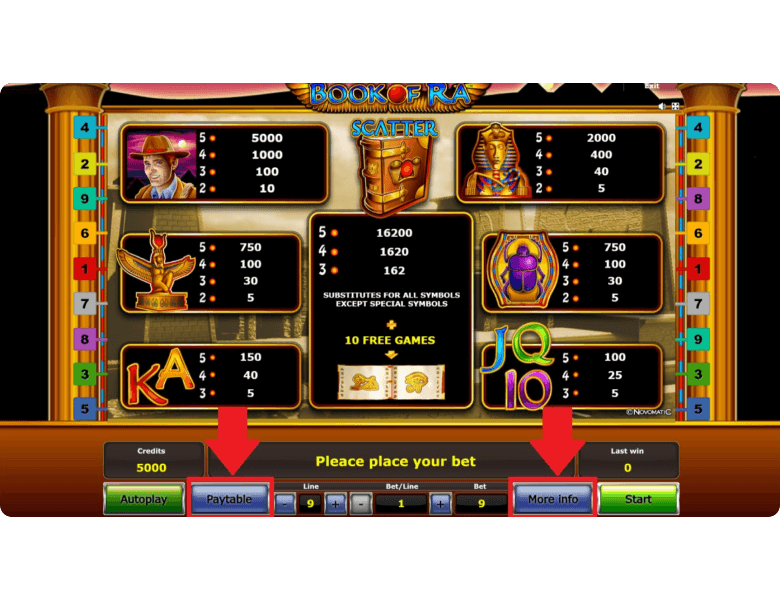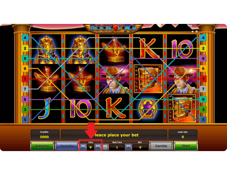 Before every spin, you decide how many paylines to activate—from 1 to 9. Winning combinations are evaluated from left to right: for high-paying themed symbols like the scarab, Isis, and the pharaoh, just two matching symbols in a row are enough, while card ranks require at least three. The gameplay looks straightforward, but beneath that simplicity lie the features that turned Book of Ra into a cult classic slot.