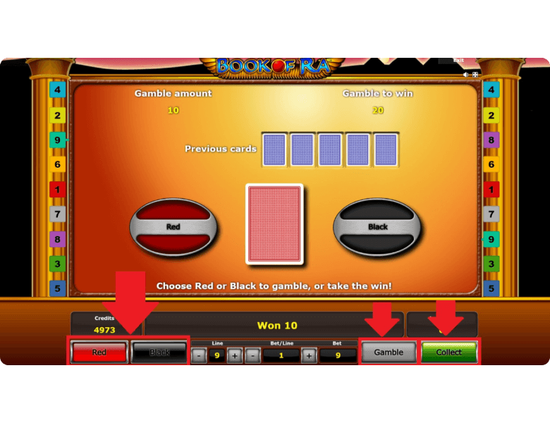 After any winning spin, click “Gamble” to take a risk and try to win more. On the next screen, choose the color of a face-down card, red or black. Guess correctly, and you win doubles, allowing you to try again. If you prefer to secure the payout, simply press “Collect”.