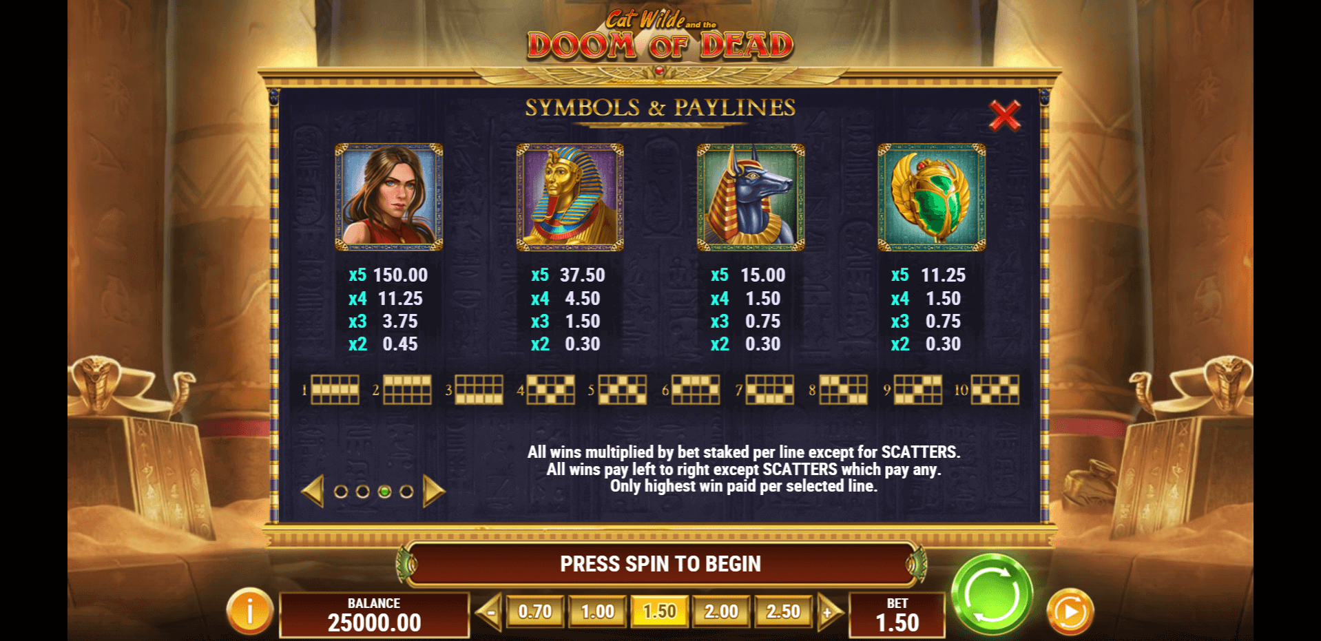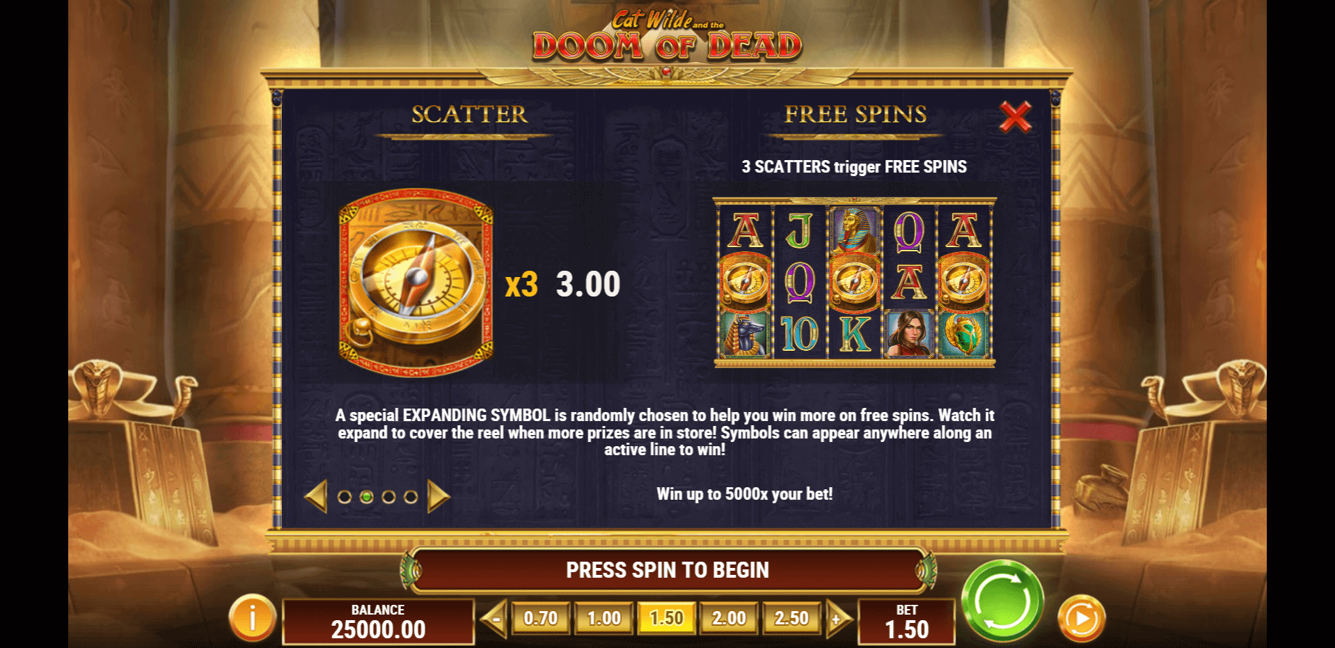 Cat Wilde and the Doom of Dead builds on the "Book of" formula made famous by Book of Dead, but with its twist. Both share the 10-payline layout, high volatility, and free spins with expanding symbols, but Cat Wilde and the Doom of Dead adds Expanding Wilds to the mix, giving the base game more punch.