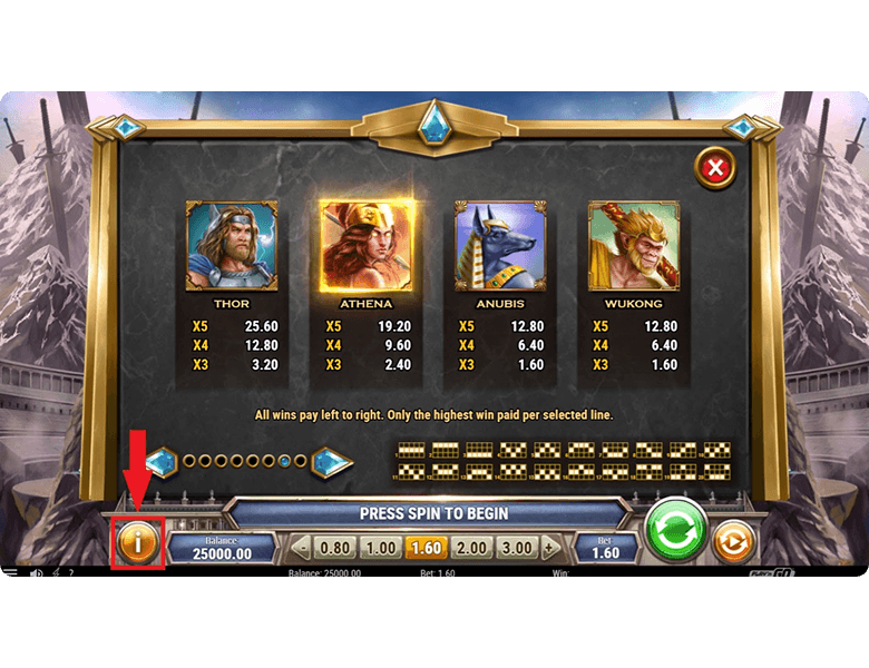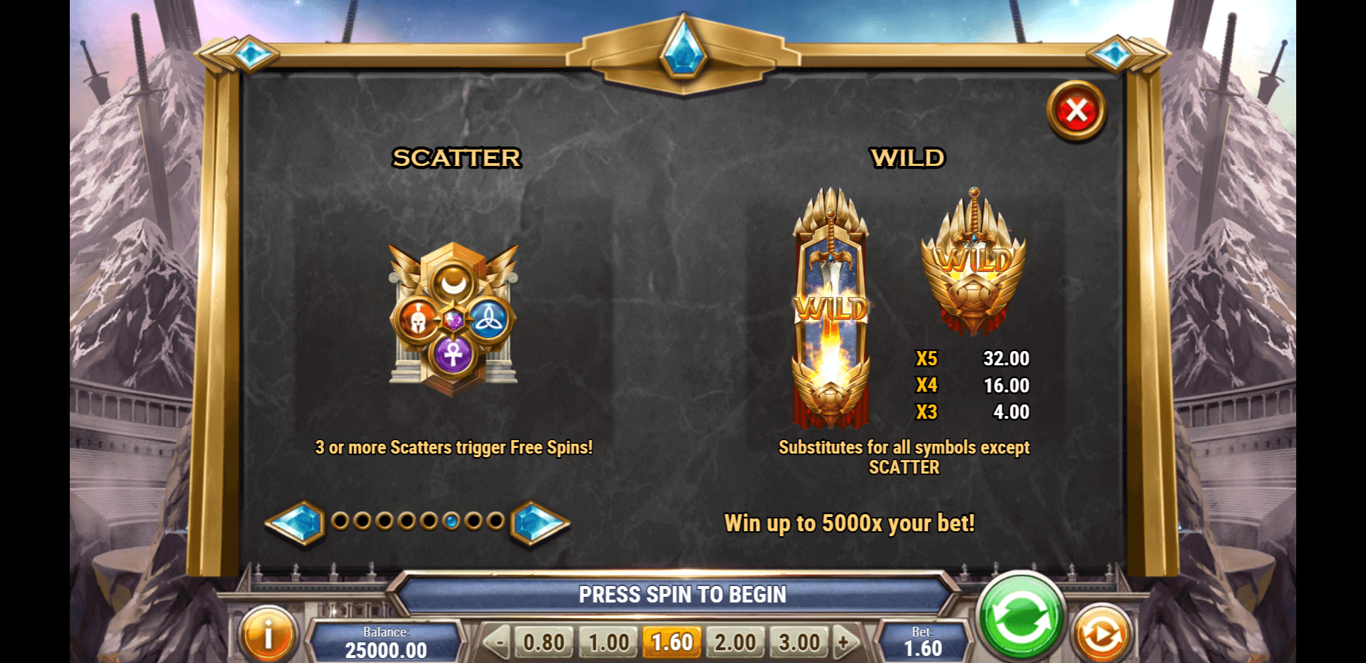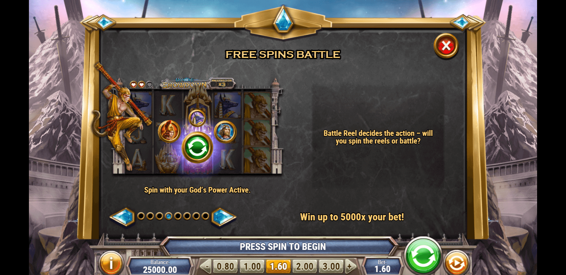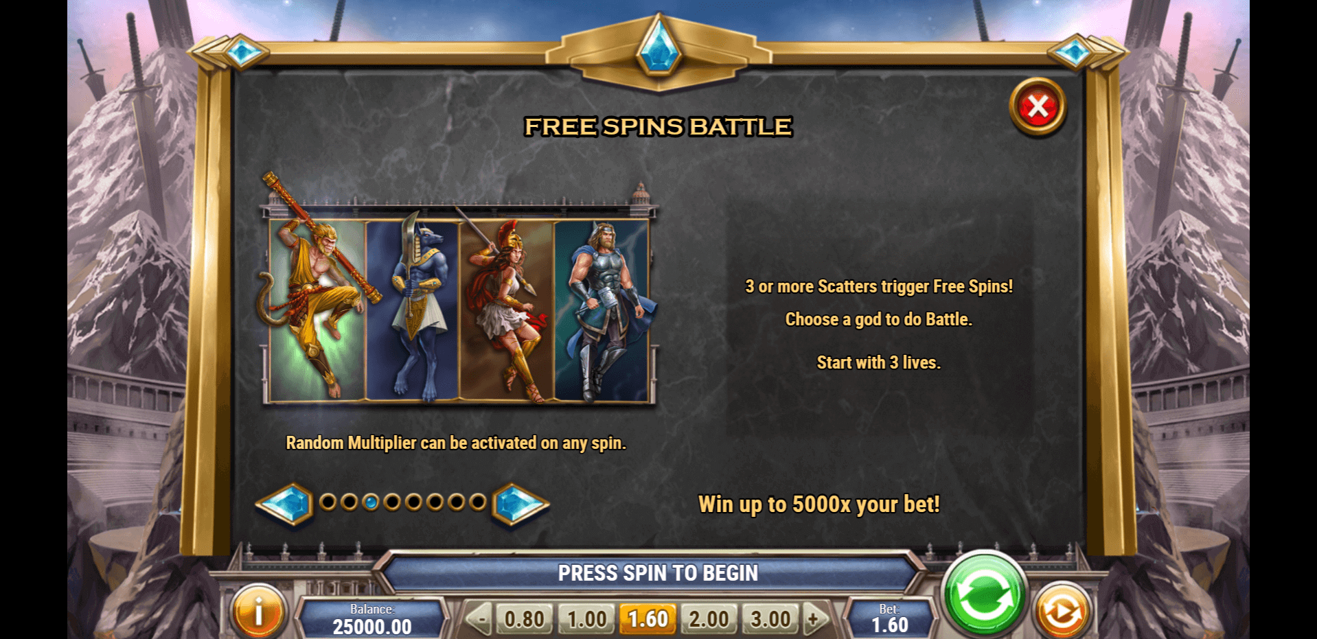 You need 3 or more Scatter symbols on the screen to unlock the Free Spins mode. When the bonus is triggered, you select one god who will fight for you in a series of battles. The game starts with three lives. Each spin activates the Battle Reel: