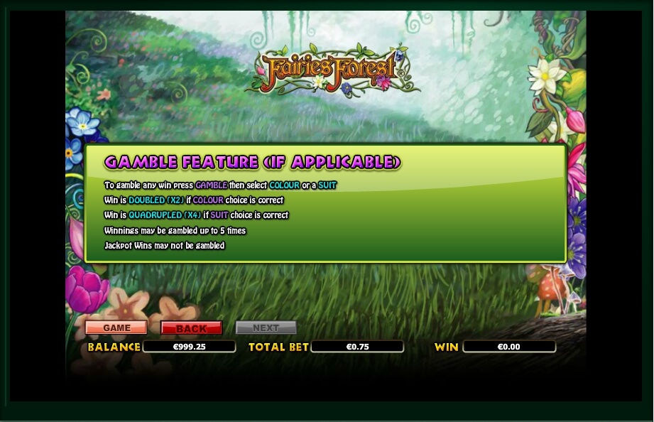 After each successful scrolling, forest fairies propose to significantly increase their winnings in the risk game. Having guessed the color of the hidden card, you can count on a double win, and if you get to the point, guessing also its suit – then the payment will be credited to your electronic account in fourfold size. At any point in the game at the bottom of the screen, you can access the Info field, where you can find any information about symbols, conditions for getting free spins, risk-playing.