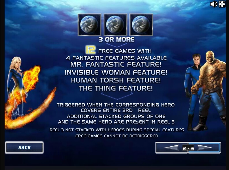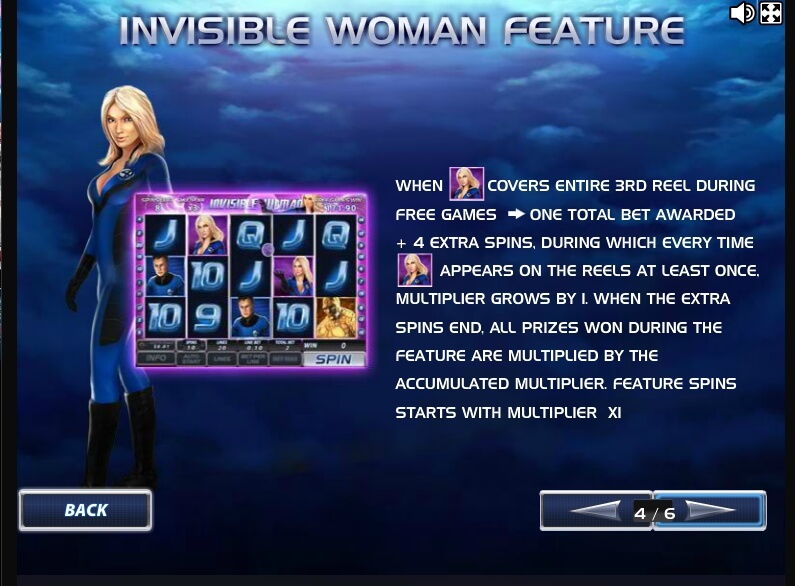 What Marvel game could be, without extra ordinal abilities of their characters? The Fantastic Four 50 lines gambling gives the player an opportunity to use superpowers of the Sue Storm to become invisible and spin the reel for free four times. It will increase your bankroll in the numerous way.