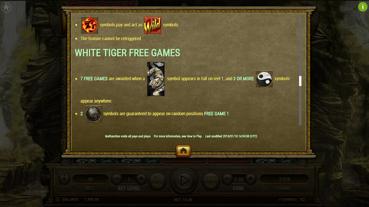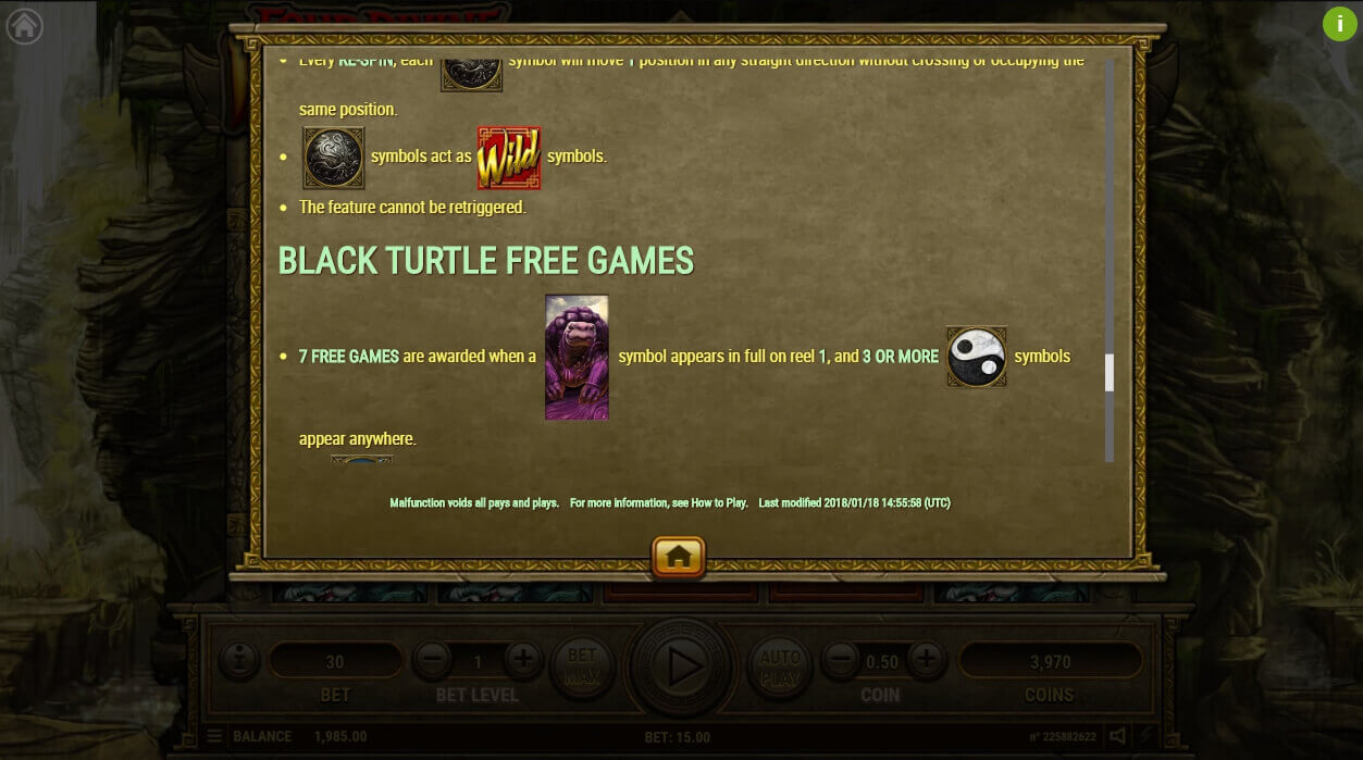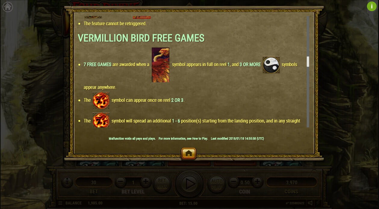 The Chinese mythology is full of mysteries that are displayed in this slot machine. Opening the game, the user will move to the mysterious mountains where four beasts live. Every detail is qualitatively depicted. Drawing is predominant in the design. In the background there are mountains and also a waterfall that is complemented by animations. In the center there is a playing field with thematic symbols that appear on 5 reels. The control panel is simple and convenient.