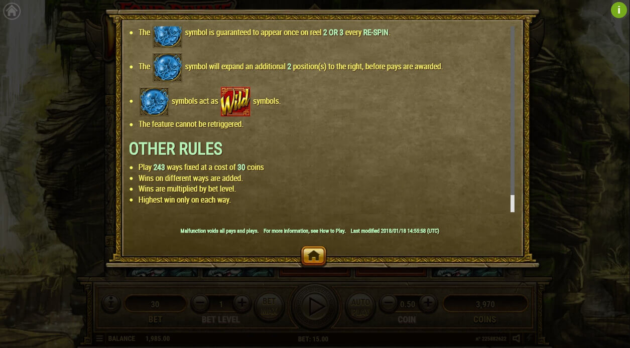 A small “i” button opens access to the theoretical section that contains information about symbols, payments and instructions. The game offers 243 ways of winning instead of standard lines. The control panel is simple and convenient. Select the coin denomination using the “Coin” button and place the bet using the “Bet Level” button. Then activate the manual or automatic game mode.