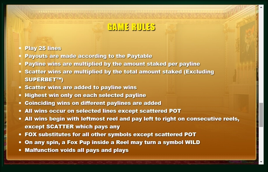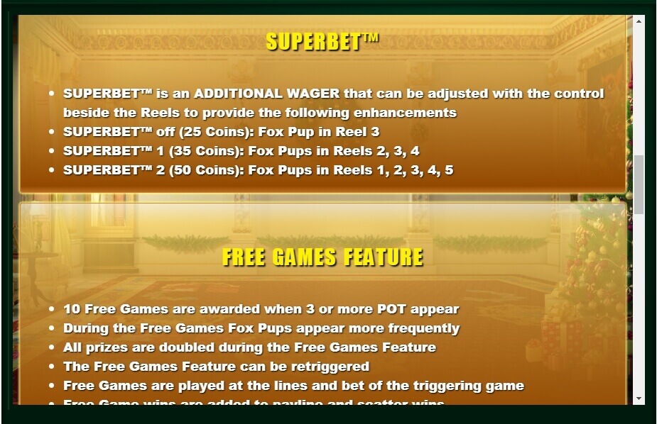 Except for the main ones, there are additional functions that are provided for the game, for example, wild symbols that can be replaced by any symbol, if there are five of them, and the winning amount is 2000 coins. Besides, an option called super bet is useful, after which the bet increases to 35 coins, and adds wild symbols in the form of young foxes.