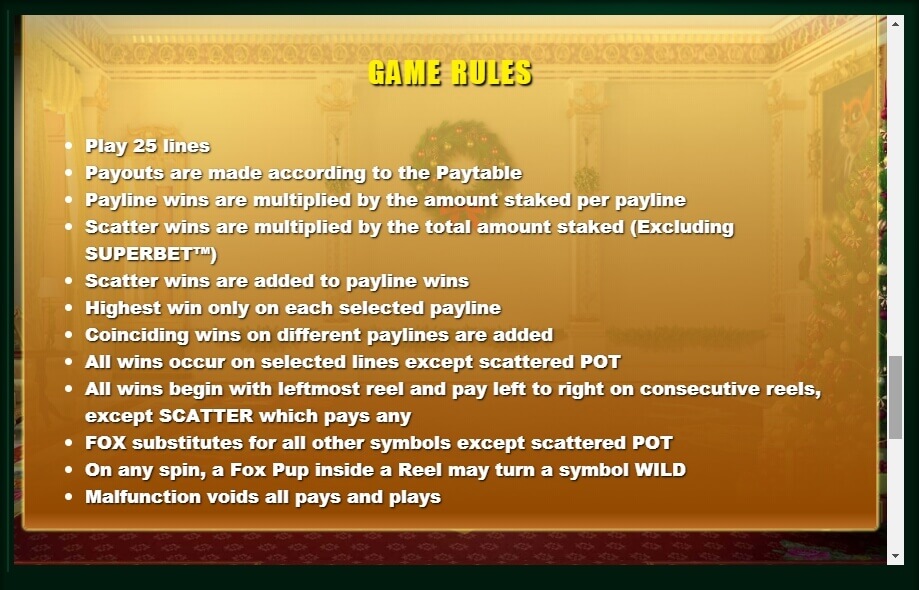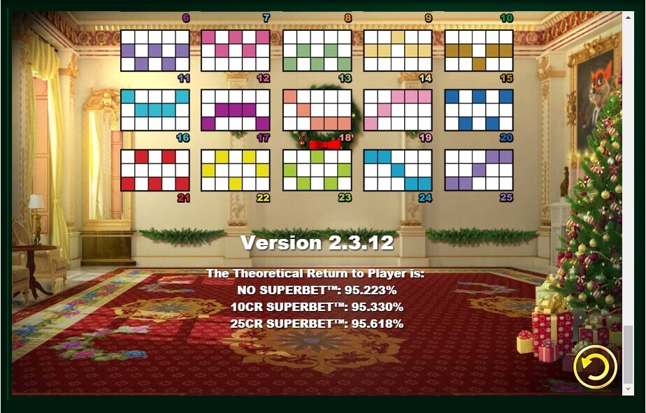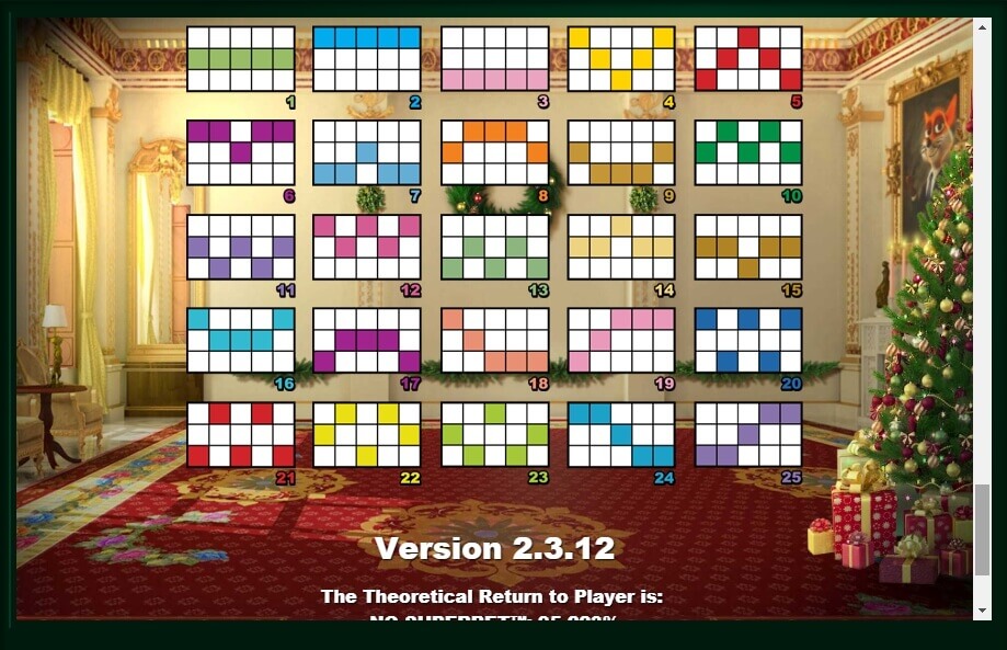 This Christmas video slot plays in 5 reels, where up to 25 active gambling lines, where the 3/5 location is to get a win, you need to match at least three characters. If the win amount on the symbol is low, then you need three, and if its value is high, then even two coinciding ones will give thevictory. The smallest sum is given for tens and nine, and the highest for kings and aces. In the table of payments there is a Christmas tree, money bills and a house made of gingerbread.