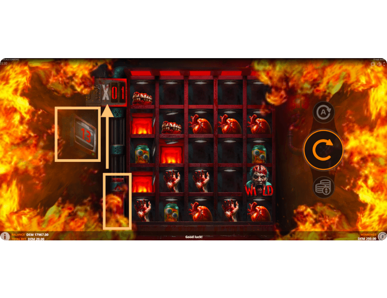 This is a bonus icon that substitutes for any regular symbol in this online slot. The Wild here is truly “wild,” designed as a terrifying zombie. By helping complete clusters, it allows players to achieve a higher payout multiplier, and the same symbol can contribute to multiple clusters at the same time. The Wild works both during the base game spins and throughout the free spins round.