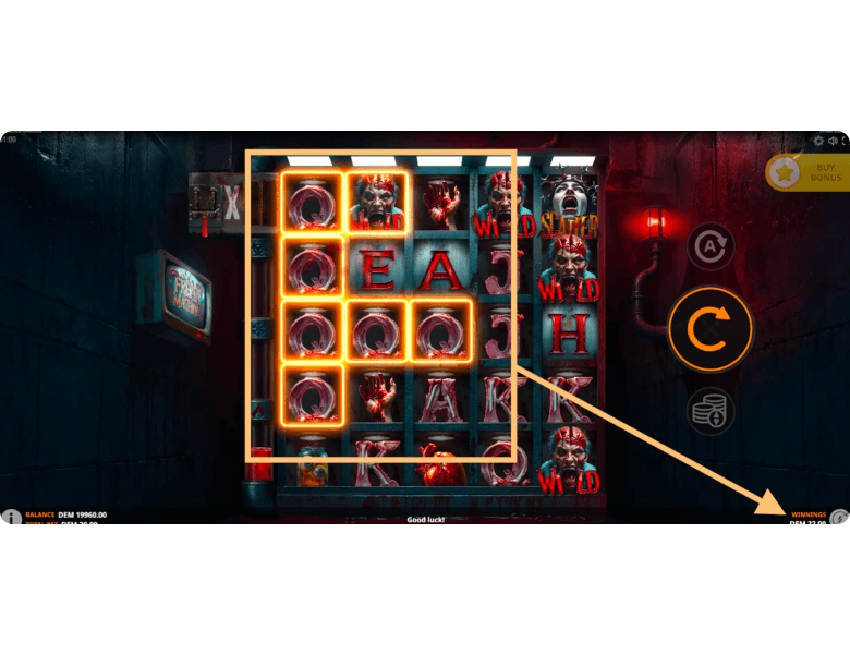 This is a unique thematic bonus in the slot machine, designed for true horror-style fans. Players must choose one of three weapons: a shotgun, a drill, or a chainsaw. The selected weapon destroys the prisoner tied to the chair in the center of the screen, allowing the participant in this bloody game to claim a random prize ranging from x2 to x36 of the total bet. Although the round’s mechanics are fairly simple overall, more sensitive players might prefer not to trigger this bonus intentionally by paying x20 the bet through the Buy Feature menu.