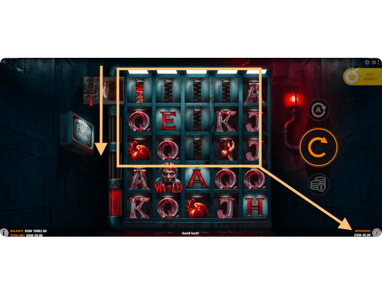 In Freak Machine, players will also encounter five additional icons represented by the letters forming the word DEATH. Each letter appears only on its designated reel, allowing players to assemble the coded word required to trigger the mini-game. The row position of the symbols doesn’t matter — the key condition is having all five letters appear somewhere on the grid. Only then will the player advance to the bonus round.