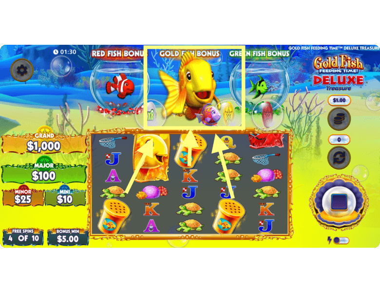 Bonus Symbols. Gold Fish Feeding Time Treasure literally lets you feed the fish — every time a food can appears on the field, the fish of the corresponding color gets its meal. Once one of the fish has gathered enough food, its bonus with free spins and unique features is activated.