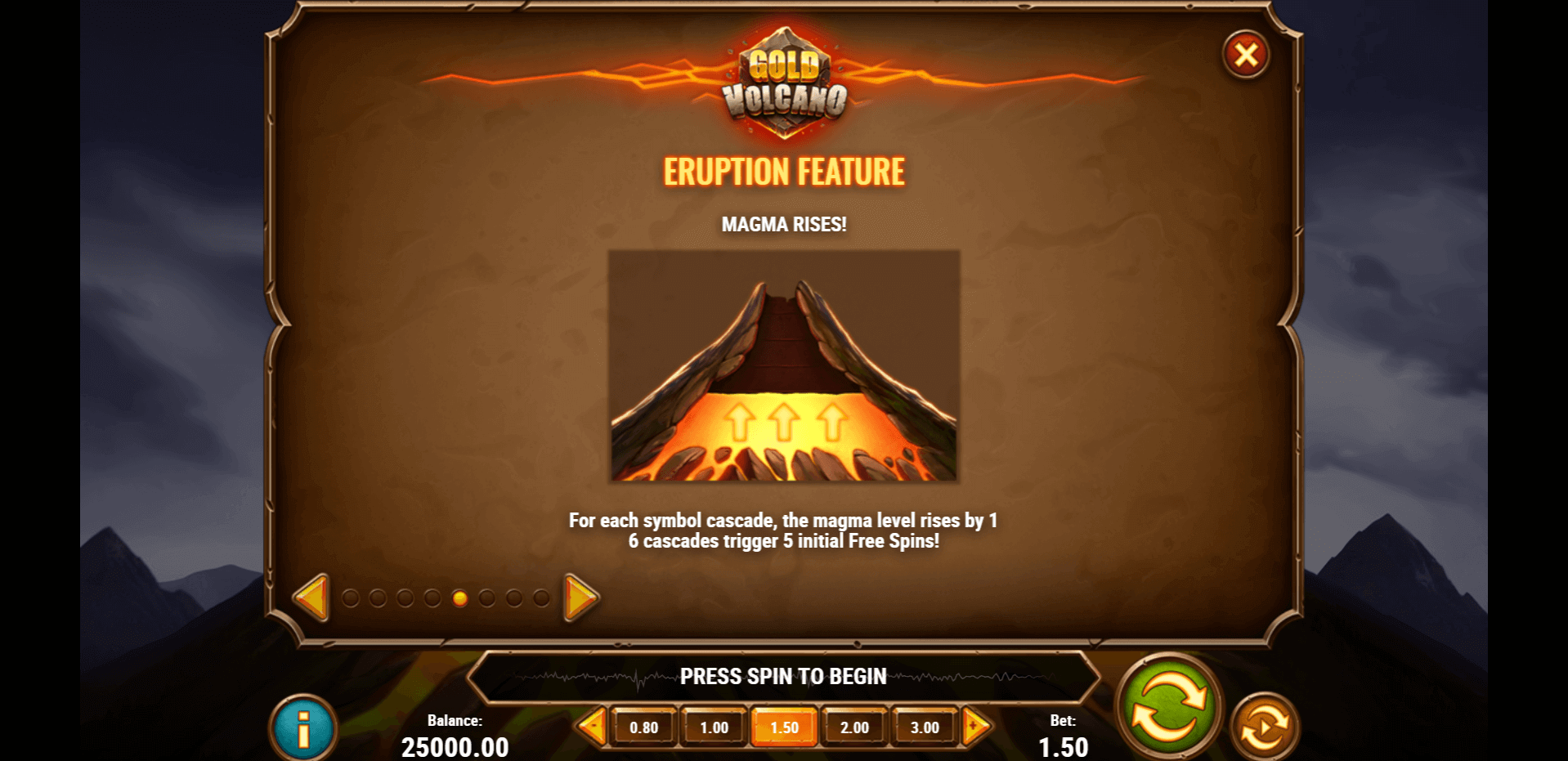 Players will have an excellent set of bonuses in Gold Volcano, and they can try them all out in the demo version. Play'n GO has done a fantastic job bringing the volcano eruption theme to life directly on the game grid, offering a unique free spin round mechanic. There are also plenty of bonuses in the base game, which trigger randomly.