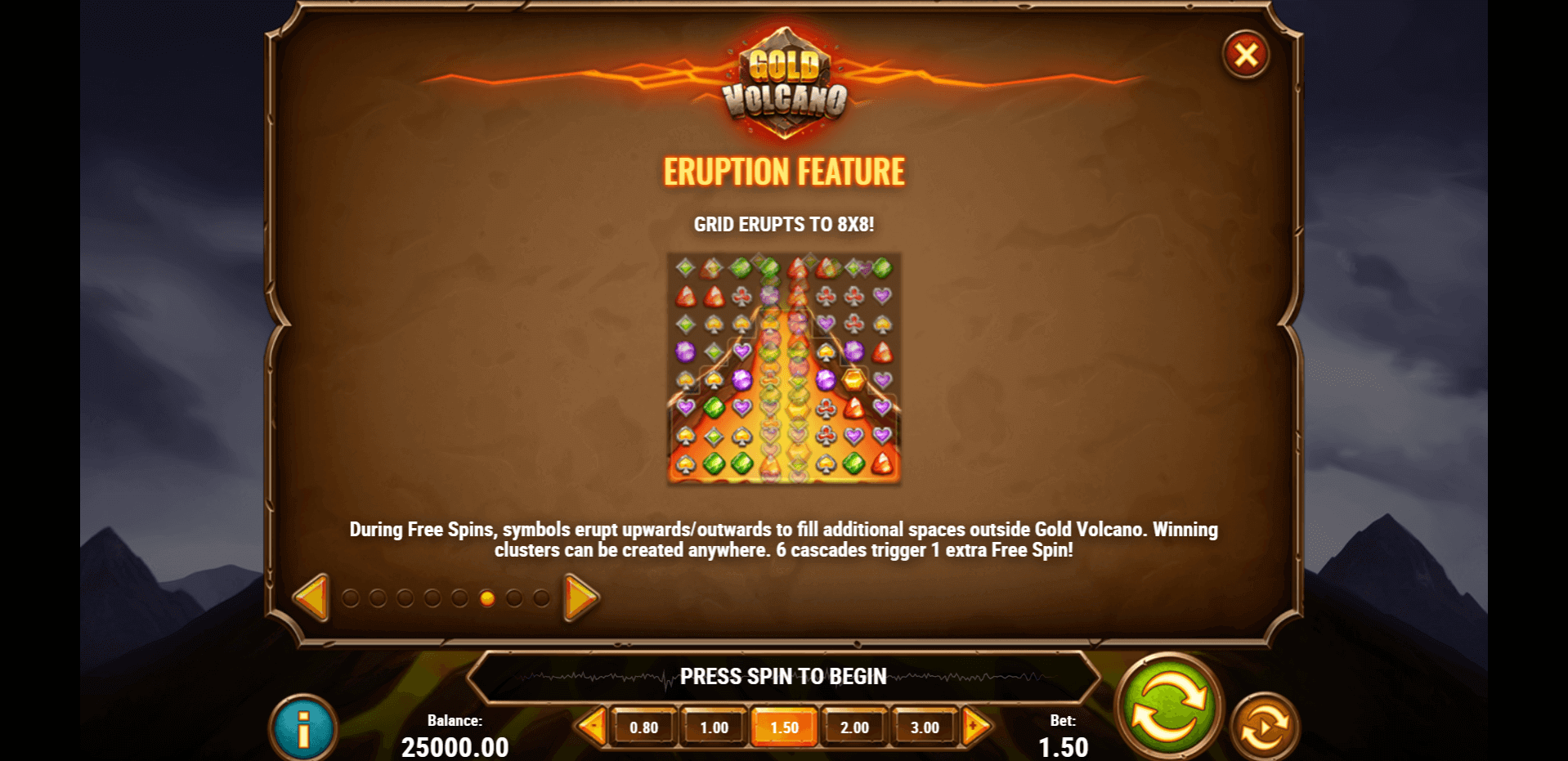 Each cascade of symbols in Gold Volcano triggers magma rising within the mountain. Once the player completes 6 cascades, the magma erupts from the volcano, and the player will receive 5 free spins. The key feature of these spins is that symbols occupy not only the space inside the volcano but also above it, giving the player a full 8x8 grid, greatly increasing the chances of winning clusters. Additionally, the crystallization feature remains active in the super game, allowing nearly the entire grid to be filled with gold symbols.
