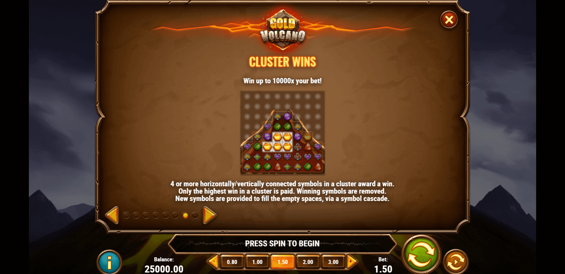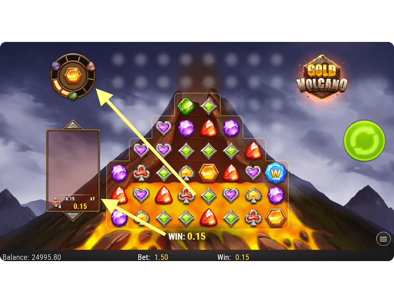 This Gold Volcano symbol complements any cluster to create a more profitable combination. The diamond with the W label simply substitutes for paying symbols, while the stone with the multiplication sign also increases the win for the cluster it is part of.