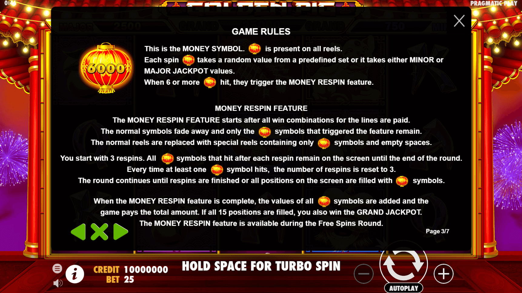 To trigger this bonus, you’ll need to land at least 6 money symbols anywhere on the screen. Once activated, those symbols become sticky, and the player is awarded 3 respins. Each time new money symbols appear, they also lock in place, and the counter resets back to 3.