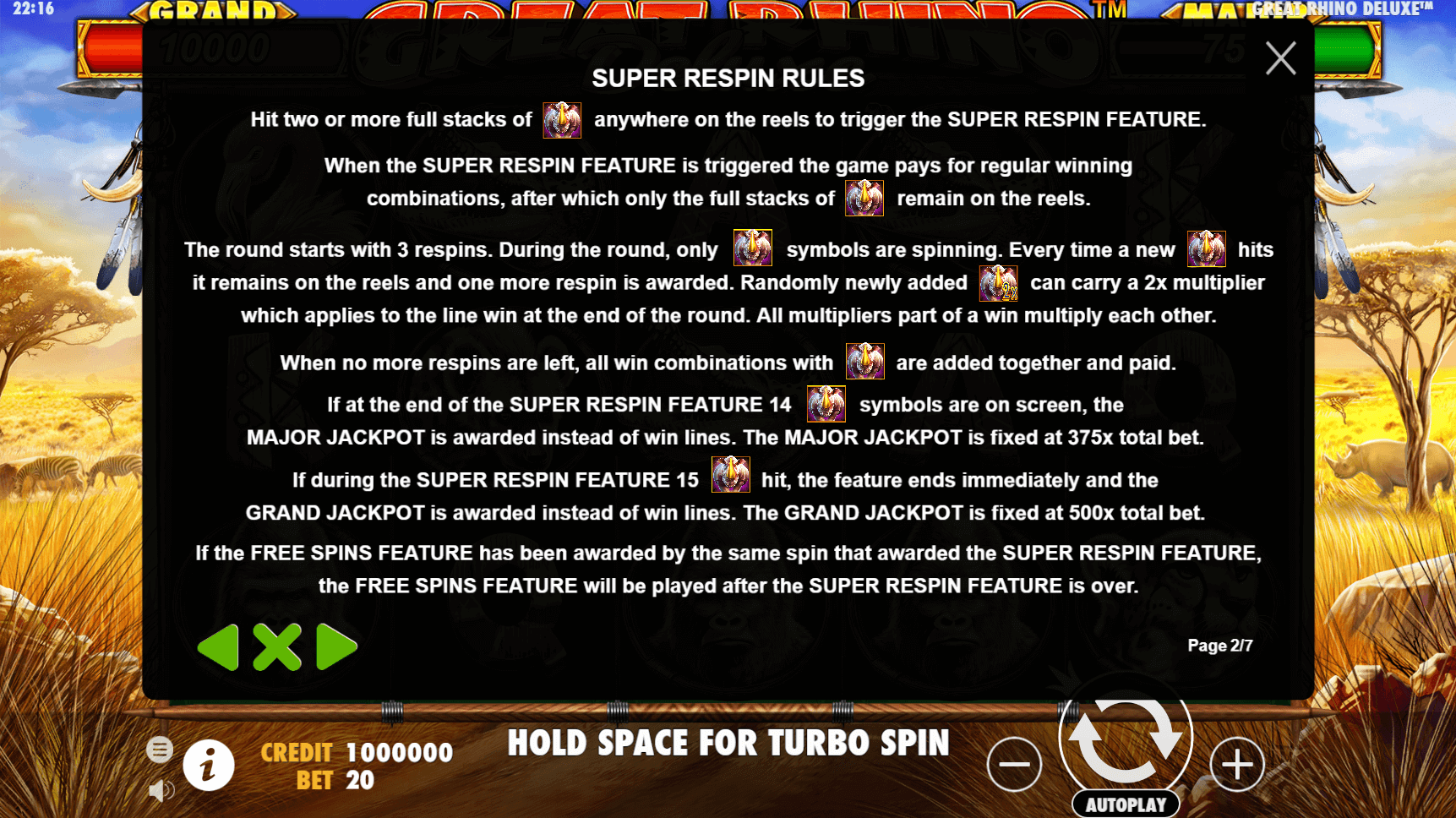 Super Respin | With sticky symbols | Rhinos can give x2 multipliers |