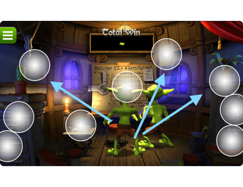 Book of Secrets symbols can land on reels 2 and 4 of the Greedy Goblins slot. When two of these symbols appear, an additional Bonus Round is triggered. During this feature, players click on different areas of the screen as goblins collect random cash rewards while searching for inspiration in an elven workshop. The round continues until a prize labeled Collect is revealed, at which point the total winnings from the bonus game are paid out.