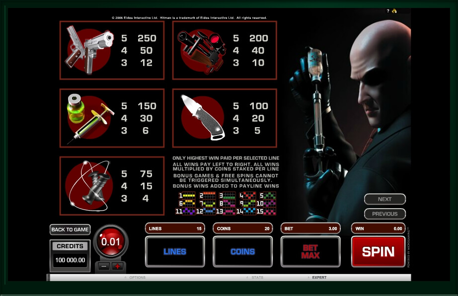 The Hitman video slot has 5 reels and 15 active lines. The number of coins is fixed: for each line, you can put from 1 to 10 coins, and the range of rates varies from 1 to 50 cents, which will please both beginners and experienced players. The jackpot in the game is equal to 4000 coins, and the payback rate of the slot is extremely pleasant – 95.8%, which is a brilliant indicator for the Microgaming video slots.