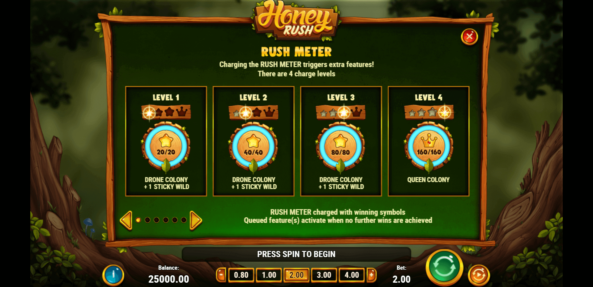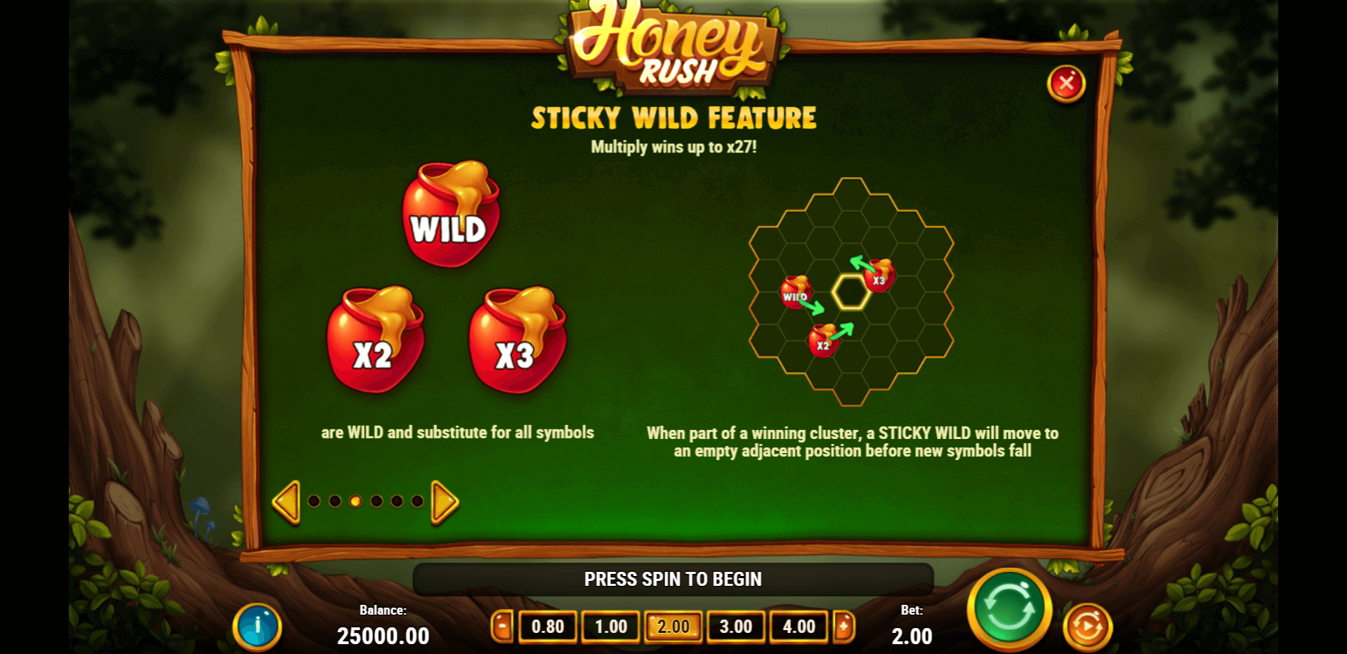 Honey Rush doesn’t use traditional paylines but a 4-5-6-7-6-5-4 grid where wins come from clusters of matching symbols. The game has several special symbols like wilds and multipliers that spice things up. The feature I found the coolest is the Honey Meter — it fills up with every win and unlocks boosters like sticky wilds and symbol upgrades. The bonus round triggered after I landed 5+ scatters, giving me up to 10 free spins and extra boosters.