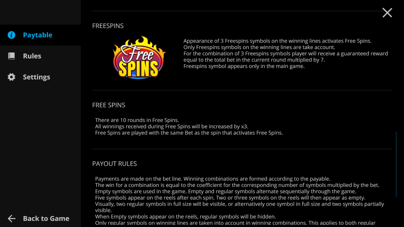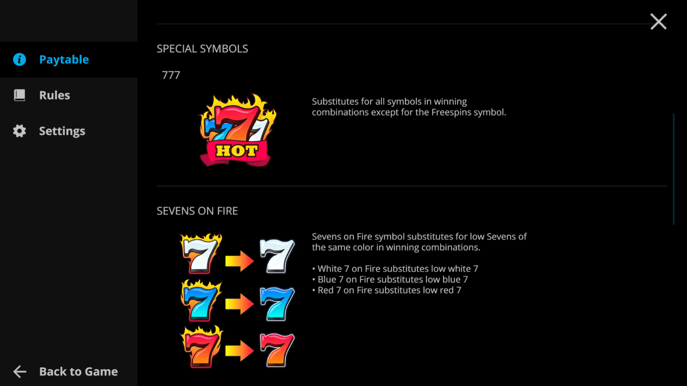 Freespins Symbol. The only symbol in the game that isn’t a 7 is the Scatter, which also serves as the Free Spins icon. If you manage to land three of these symbols anywhere on the reels — regardless of paylines — you’ll trigger 10 free spins, during which all winnings are multiplied by 3x. On top of that, the game awards an instant payout equal to seven times your current bet, adding an extra reward to your bonus round wins.