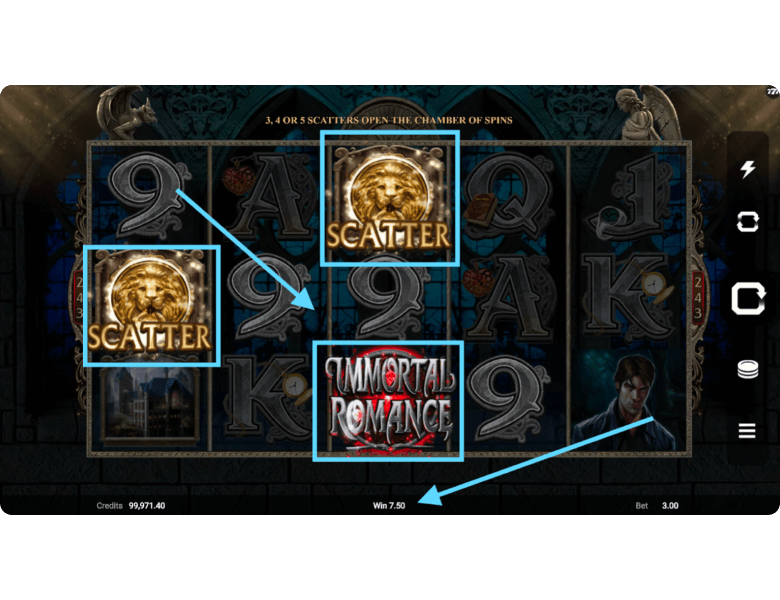 Scatter. All bonus rounds in Immortal Romance are triggered by the Scatter symbol. It pays starting from just two icons on the reels, regardless of their position. Landing 3, 4, or 5 symbols opens The Chamber of Spins, where players can choose one of the available bonus modes. The symbol can also appear during an active bonus round, allowing the feature to be retriggered.
