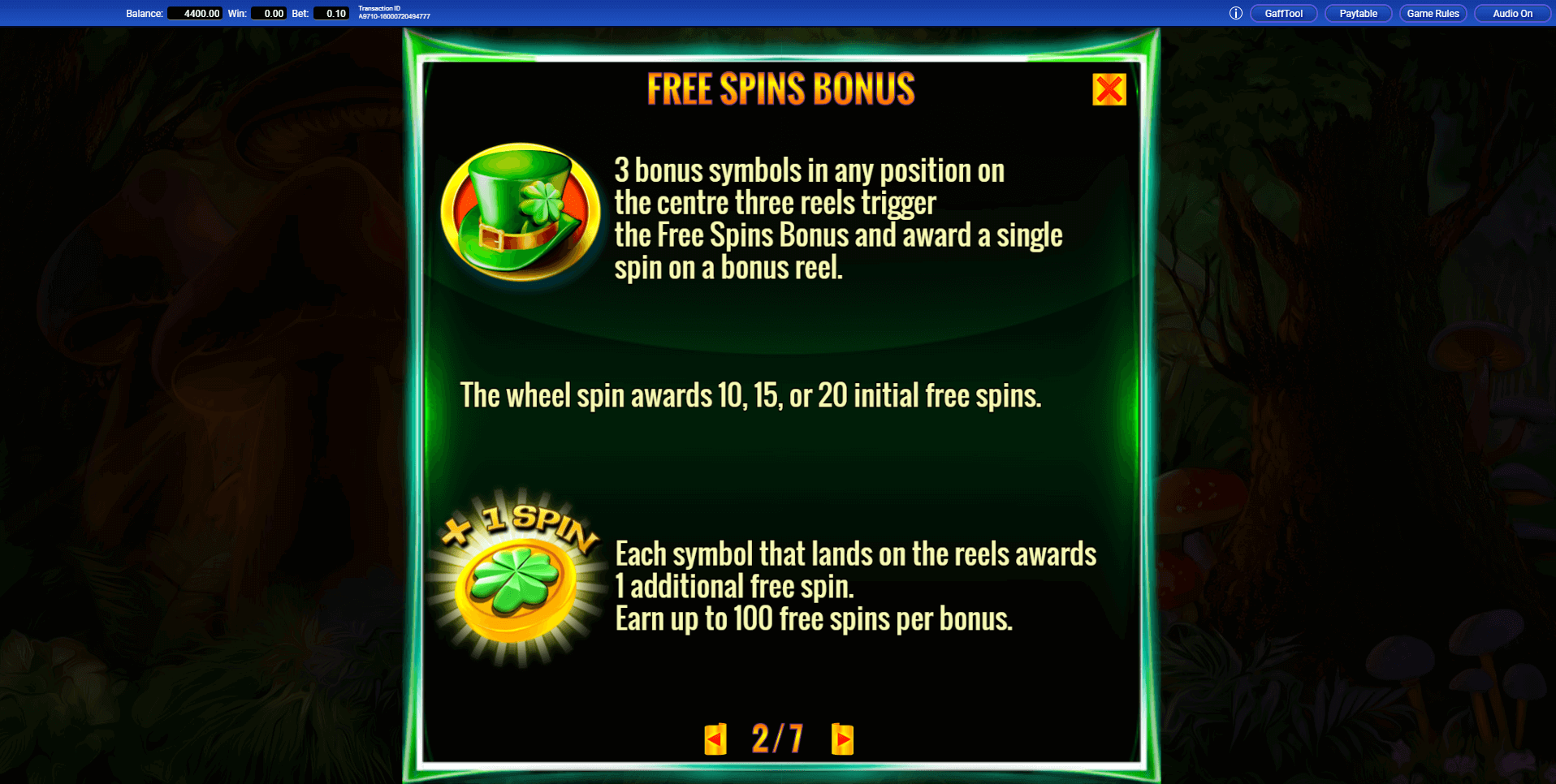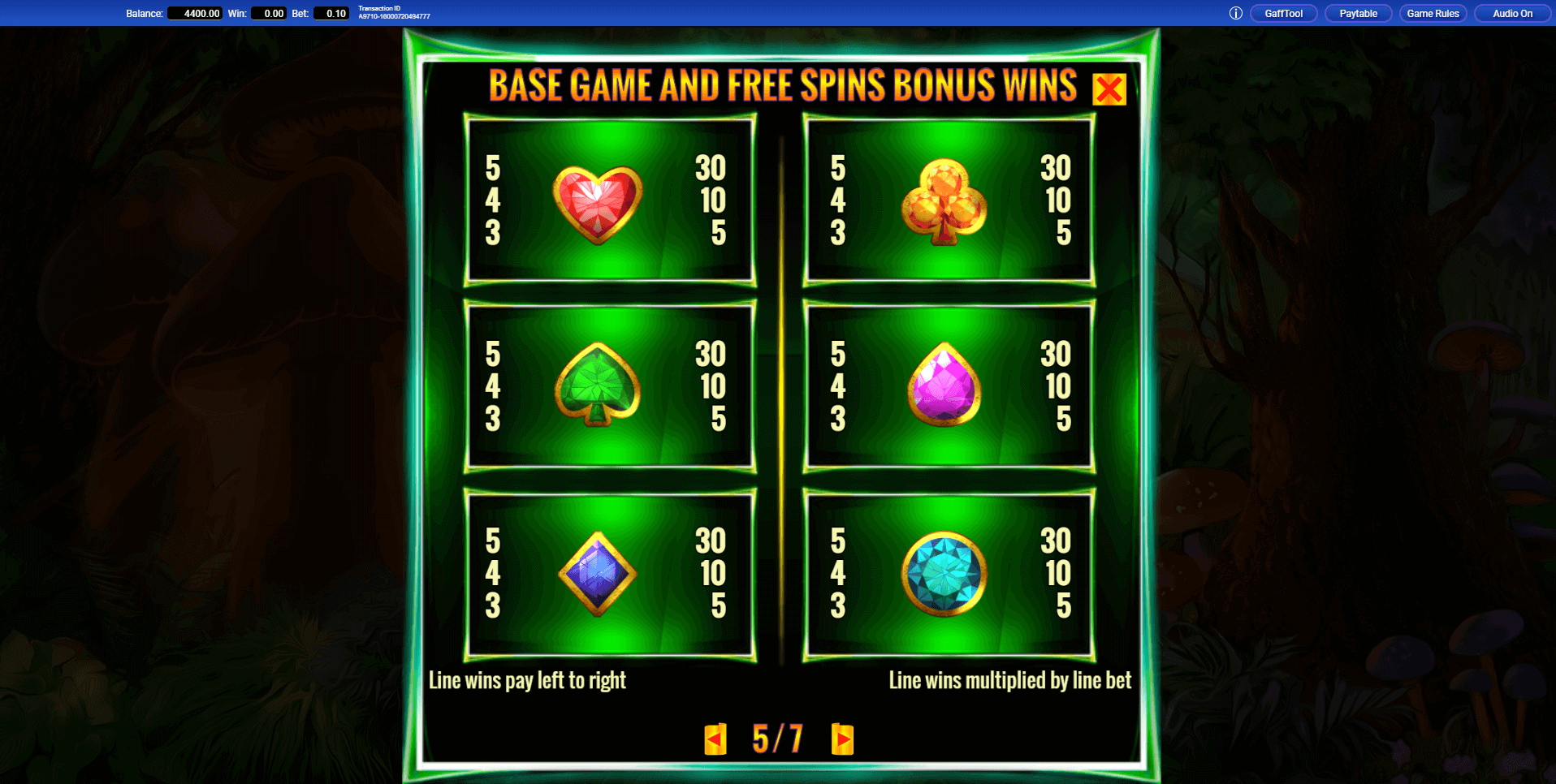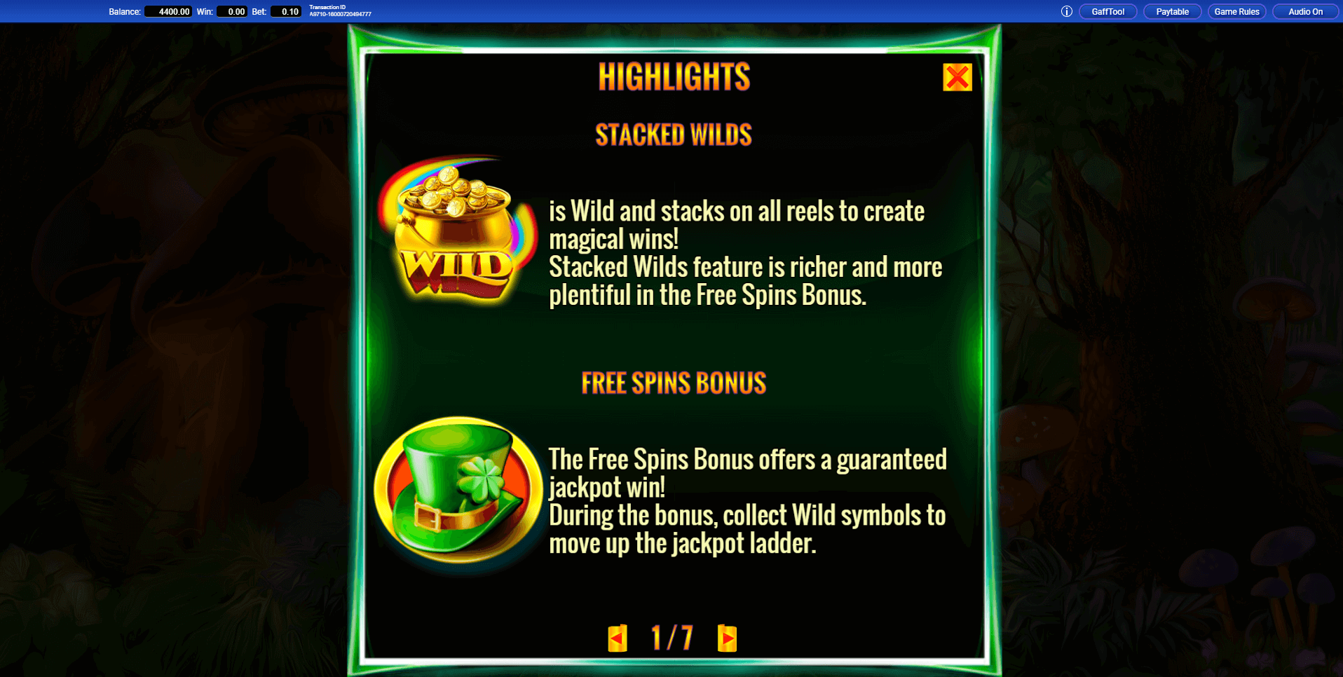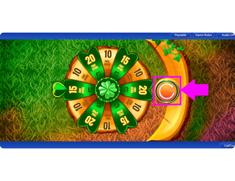 In demo mode, you can experiment with different gameplay scenarios. Click the button in the lower-right corner to open the Gaff Tool menu. From there, choose a scenario — for example, triggering free spins or landing a Wild — to see how each feature works in action.
