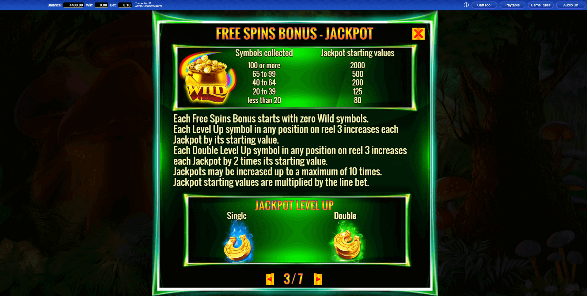 During the free spins, every Wild symbol that lands contributes toward winning one of the game’s five jackpots. These symbols accumulate in a counter displayed on the left side of the screen. At the end of the bonus round, the total number of collected Wilds determines your jackpot prize according to the following scale: