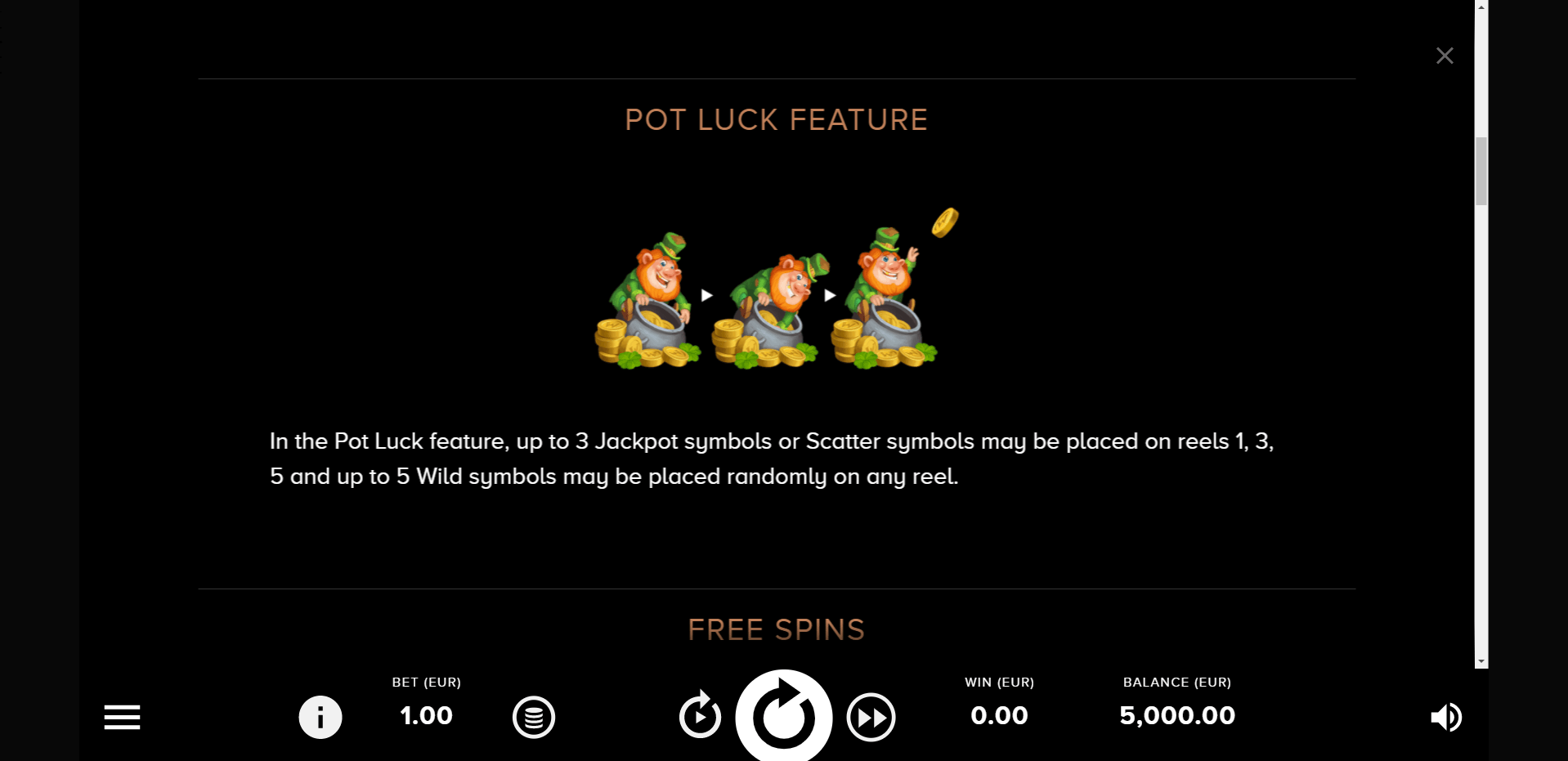 Irish Pot Luck plays clean and steady. You get 20 lines, medium volatility, and just enough random triggers to keep the base game engaging. The leprechaun randomly adds multipliers, wilds, or jackpot triggers, something I didn’t see happen much in Cash Coaster or Venice Carnival slot, where gameplay felt too flat. This one stays lively, even without heavy animations or layered mechanics.