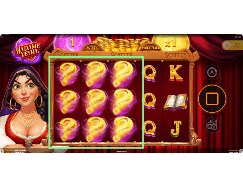 Another bonus feature in Madame Veyra is the set of mysterious Special Symbols. When they appear on the reels as question marks, they can transform into matching paying icons. Moreover, during the bonus round, these symbols can even turn into Scatter or Wild symbols, extending the round or creating additional winning combinations on the reels.