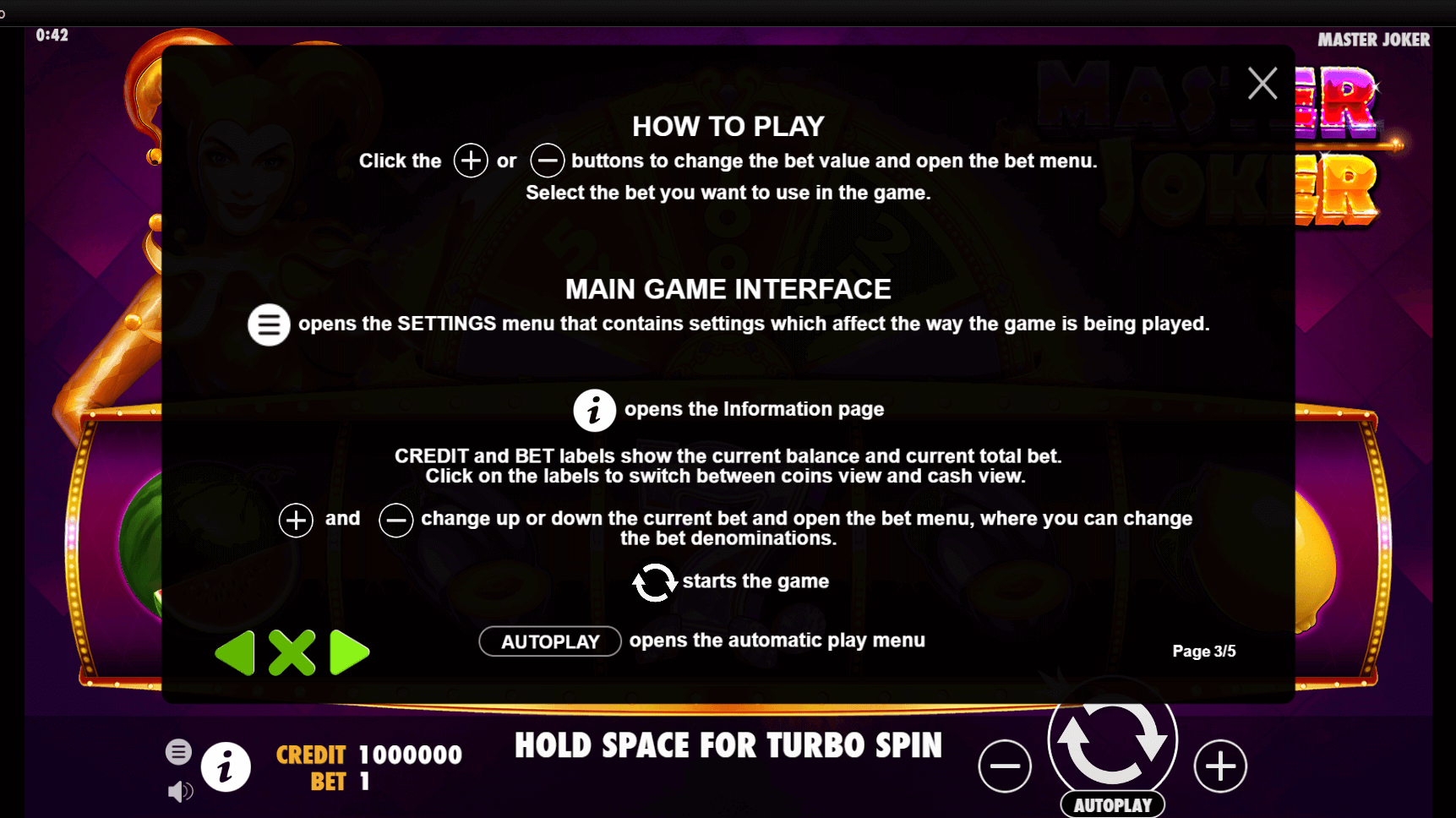 The visual style sticks to glossy fruits and shimmering symbols. The Joker character stands to the side of the reels, occasionally animating when the Multiplier Wheel activates. The soundtrack and sound design perfectly match the theme. The only thing that felt distracting to me was the reel spin sound — it added a bit of mess. Still, compared to Joker’s Jewels, where the sound design is completely chaotic, Master Joker felt much more polished.