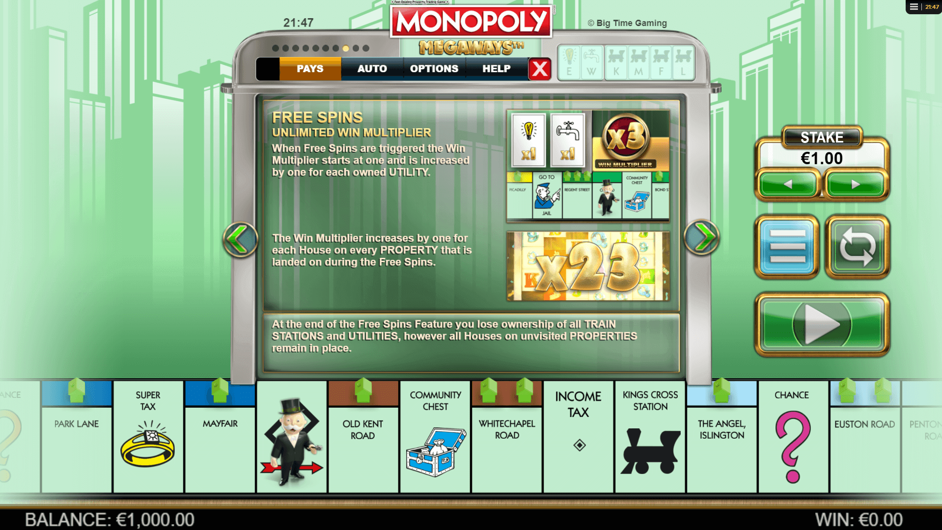 Every time I won a spin, my Mr. Monopoly stepped forward on the board, purchasing the property on which he landed. Every time I strung together three winning spins, he built a house. The goal was to purchase and build up everything, so I could land more multipliers and free spins during the retriggerable free spins round.