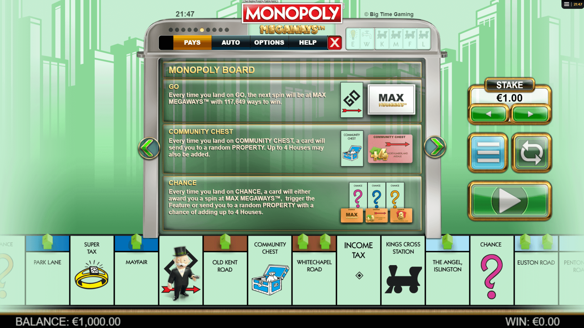Three features fuel the fun the most in base play: Chance cards, cascading wins and a guaranteed spin with 117,649 megaways upon landing on ‘Go’. I found them profitable on their own while I waited to enter the big-bucks round. I felt the cascading wins setup yielded more wins than, say, Gates of Olympus.