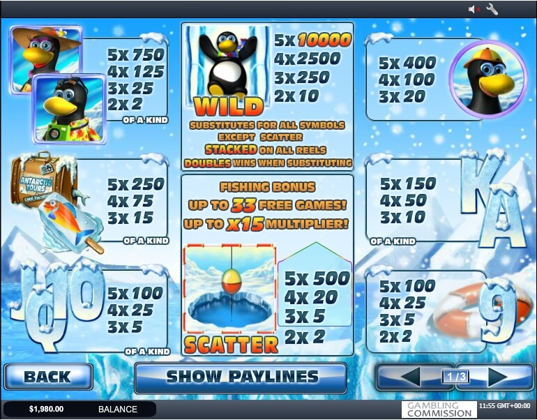Funny penguins, frosty weather, lots of treasures are waiting for players at this game. All players need to do look deeply under the ice Thiers is the treasure. See carefully the table of payments and get acquainted with the premium presented in it. Signs cards from 9 to ace. These signs are common at the game. With the right combination, players can get 5 to 150 credits.