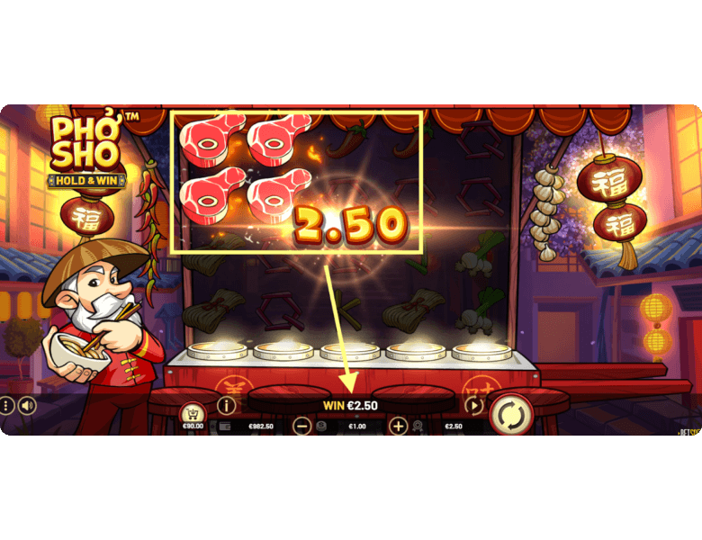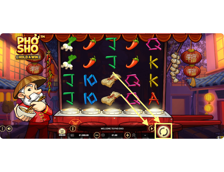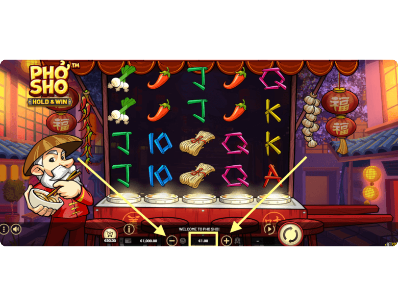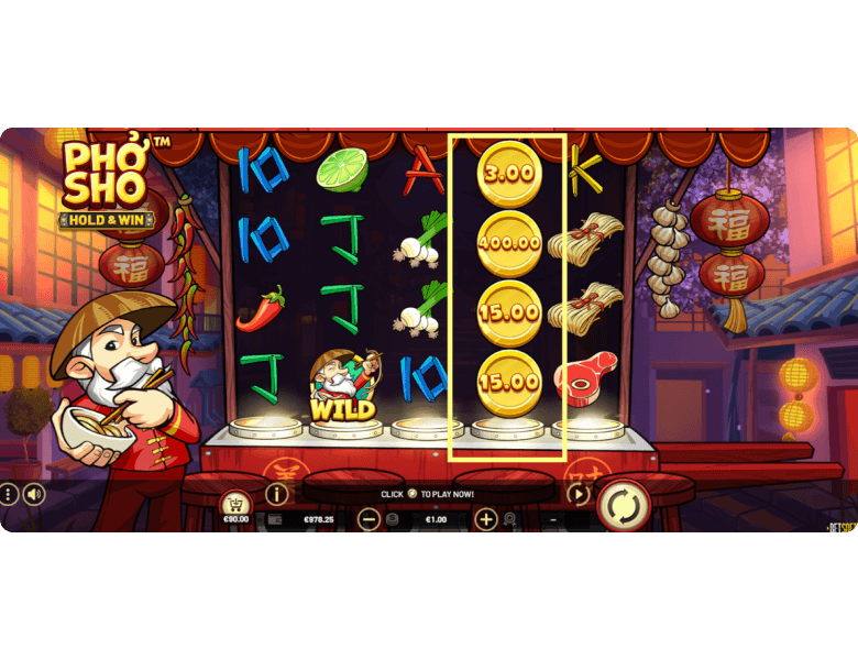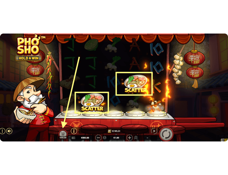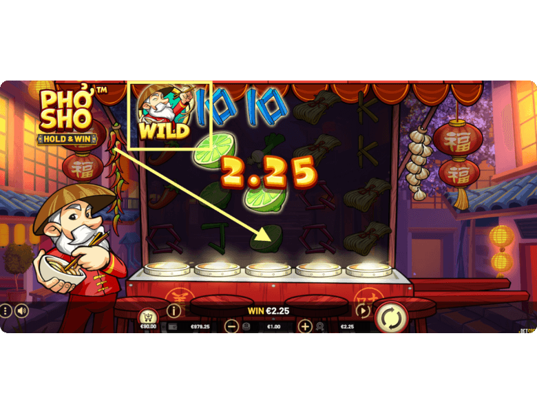 Wilds. Pho Sho also features a Wild symbol represented by the Asian chef himself. This symbol can appear on all reels and substitutes for any regular paying icon, except for Scatter and Coin symbols. Its purpose is to create winning combinations where none existed before — or enhance existing ones to help players land the best payout.