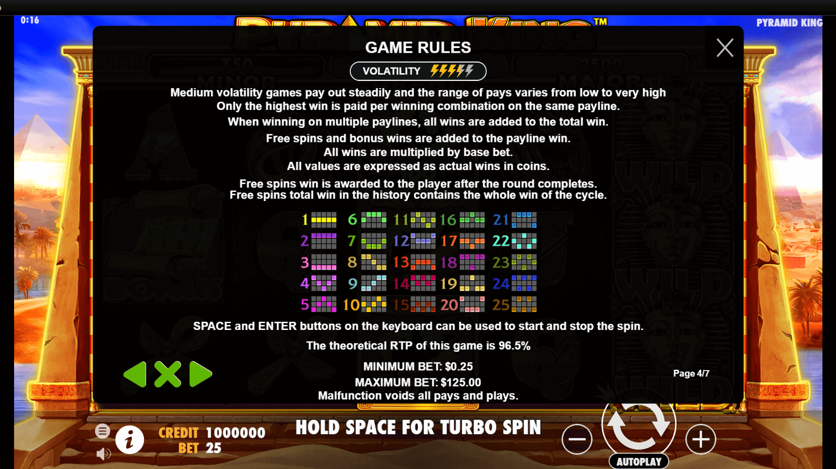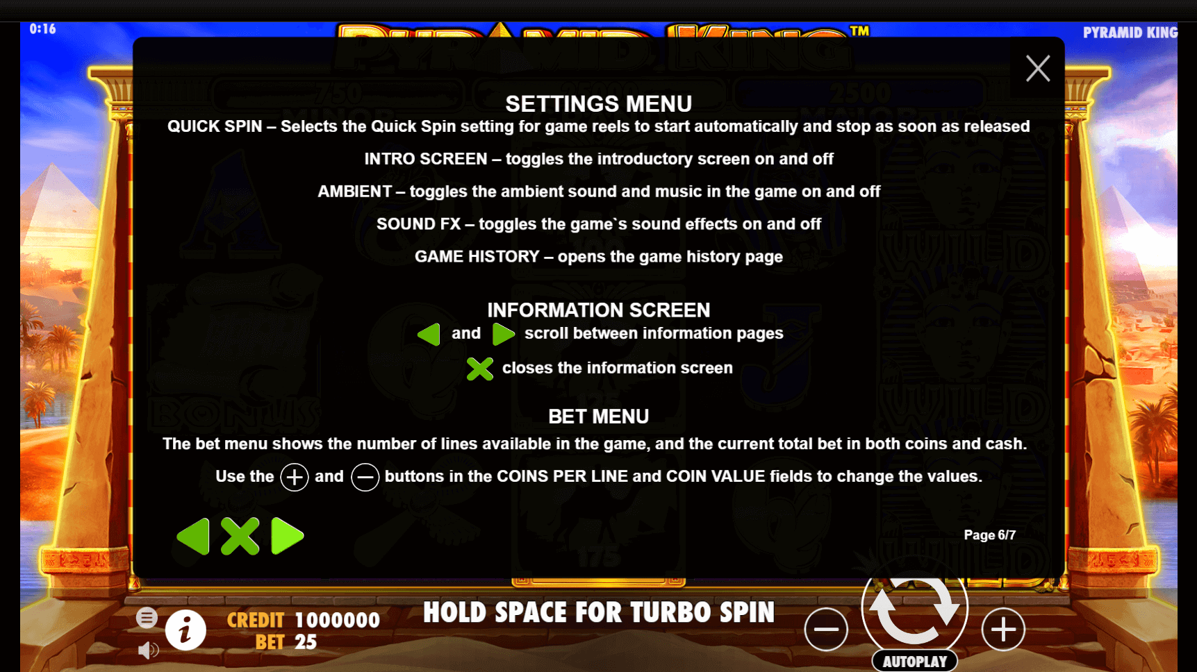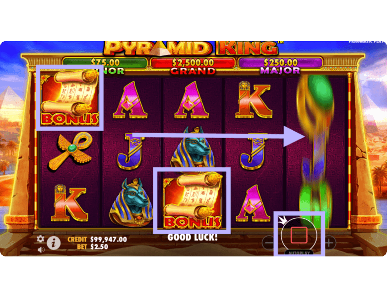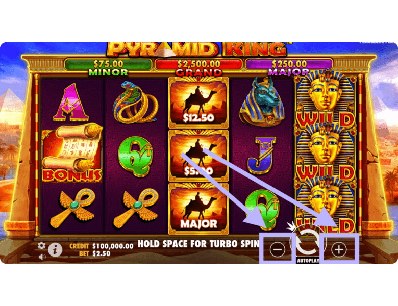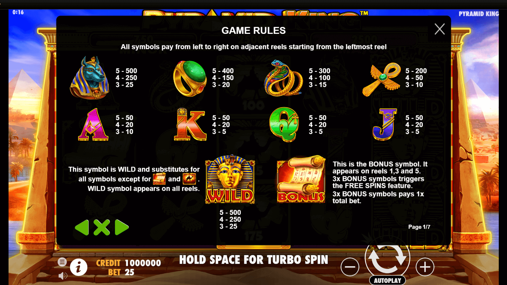 All adult players can play Pyramid King for fun on our site using the demo mode of the online slot. The game is also available at popular online casinos from our rankings. To get your first wins, simply click on the slot machine image on this page and follow the easy step-by-step guide.